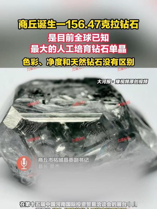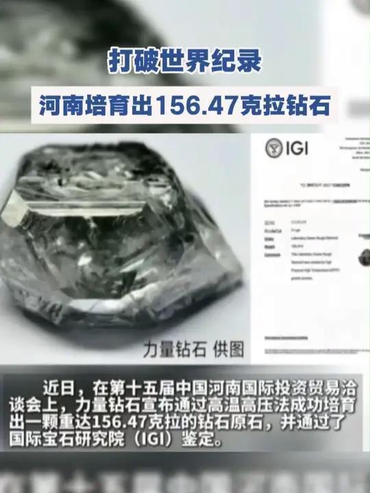 全球最大!河南柘城培育出156.47克拉人工钻石单晶 河南力量钻石造出了“钻石之王”!156.47克拉的培育钻石原石,经IGI认证登顶全球最大人工培育钻石单晶,把2022年150.42克拉的纪录远远甩在身后。 这颗巨钻可不是天然开采,全靠高温高压法“点石成金”。机器里1300—1500摄氏度高温撞上5—7GP超高压,模拟出地下亿万年的形成环境,却只用数周就让石墨蜕变成钻石 。谁能想到,和铅笔芯同成分的碳,在河南柘城的车间里,竟长成了闪耀的“大块头”? 这突破哪是偶然?力量钻石早把技术刻进骨子里,不仅手握国家科技进步奖,还填补过国内技术空白 。更厉害的是,这技术不止造珠宝,还能变身高科技“救星”——金刚石散热片热导率是铜的5倍,正帮芯片解决“散热焦虑” 。 河南本就是“中国钻石之都”,柘城培育钻石产量占全国半壁江山。这颗156.47克拉的钻石,是河南智造的勋章,更是中国在超硬材料领域的底气。 科技的力量有多惊人?这颗钻石就是最好的答案。