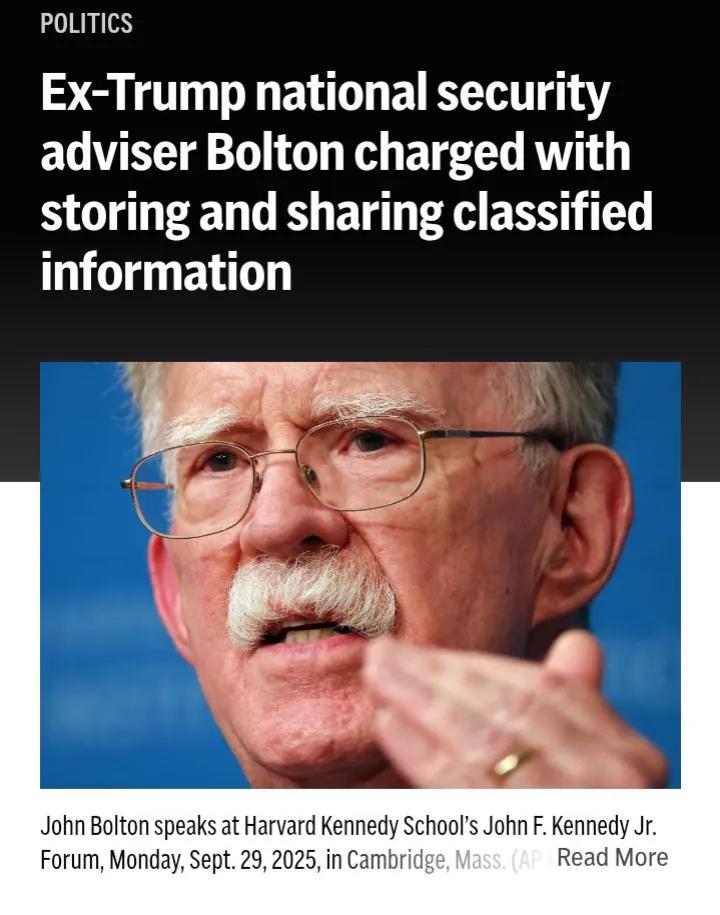 据美媒报道称,前特朗普政府国家安全顾问约翰·博尔顿周四被指控在家中存储绝密文件,并向亲属分享包含机密信息的政府工作日记式笔记。 这份18项指控的起诉书还表明,2021年,当行动人员认为与伊朗政权有关的黑客入侵博尔顿的电子邮件账户并获取他分享的敏感材料时,机密信息可能被泄露。 检察官表示,博尔顿的一名代表告诉FBI,他的电子邮件被黑客入侵,但未透露他通过该账户分享了机密信息,也未说明黑客目前已掌握政府机密。 对博尔顿的调查在公开视野中爆发是在八月,当时FBI搜查了他在马里兰州的住所以及位于华盛顿的办公室,寻找他可能从在政府任职期间保存下来的机密文件。 这一起诉为一桩备受关注的法庭案件铺平了道路,案件的焦点是一位长期活跃于共和党外交政策圈的人物,他以鹰派的美国权力观点而闻名,后来成为特朗普的著名且直言不讳的批评者。 尽管产生起诉书的调查在拜登政府期间已经进行得相当深入,但此案将在更广泛的背景下展开——公众担心特朗普正在利用司法部对总统眼中的敌人进行打击,同时对他的盟友网开一面,免于审查。