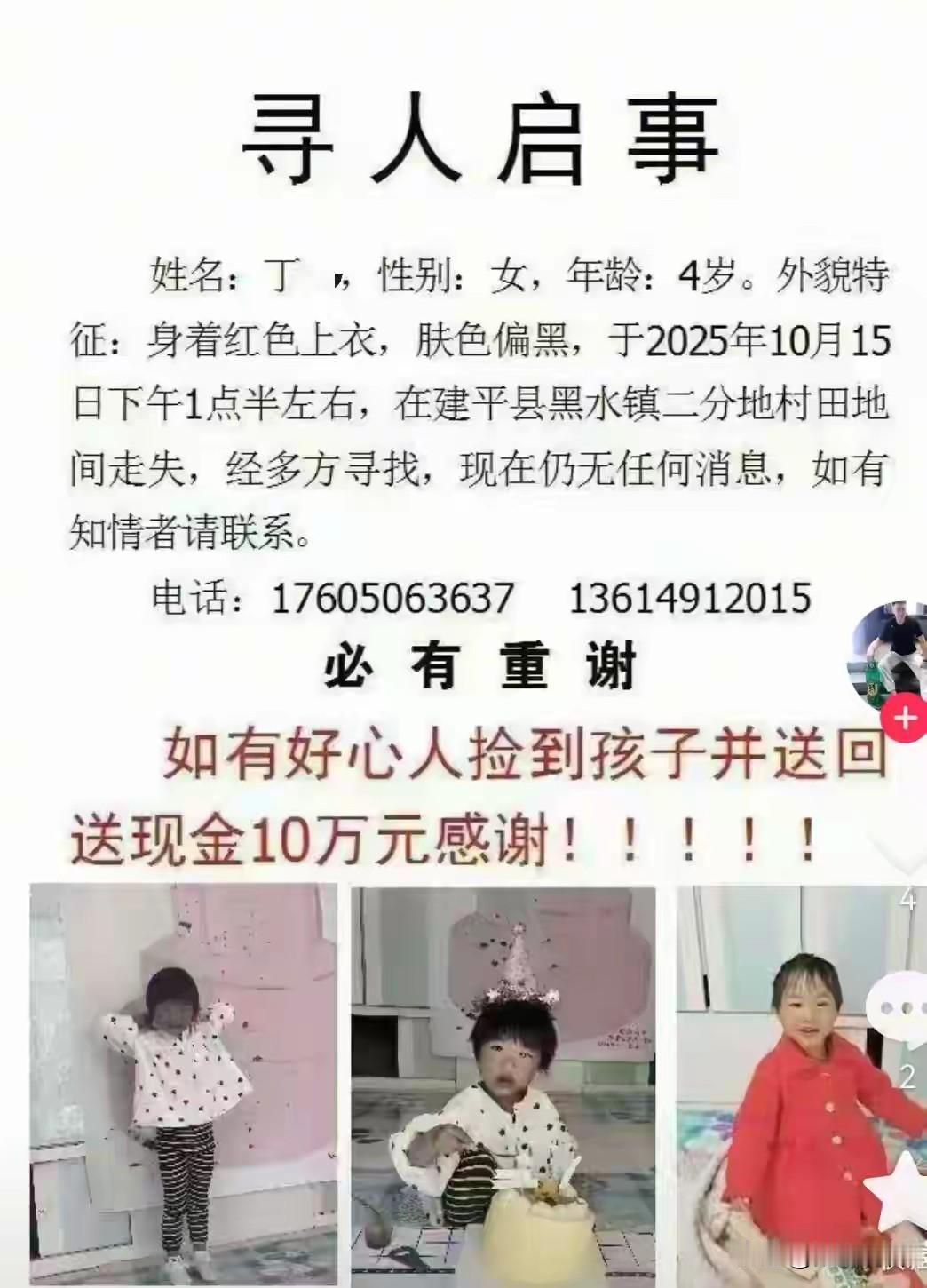 揪心到睡不着!辽宁4岁女童车内失踪,上千人搜救仍无音讯😭 谁刷到这个消息不着急啊!辽宁朝阳4岁女童丁一失联超过40小时了,每看一条进展心都提到嗓子眼… 事情是这样的:10月15号下午1点多,爷爷奶奶带孩子去山上收庄稼,把熟睡的小孙女留在200米外的面包车里,还特意留了车窗缝透气。20多分钟后看孩子还在,可半小时后再回来,车窗被摇开,娃没了! 孩子爷爷都快崩溃了,说娃才3岁多,胆子特别小,根本不敢自己摇车窗翻出去,怀疑是被人抱走的。更让人揪心的是,事发地在山顶,全是耕地、梯田,植被又高又密,还有3公里长的大断崖,附近甚至有鹰活动… 消息一传开,整个村镇都行动起来!截至16号下午,1500多人次参与搜救,民警、救援队、爱心市民全上了,无人机热成像、搜救犬都用上了,方圆四五公里搜了好几遍,可搜救犬到马路边就没了气味,线索断了… 远在外地的父母连夜赶千里回来,爸爸红着眼眶悬赏10万:“只要娃能回来,倾家荡产都愿意!”奶奶抱着孩子的玩具瘫在车旁哭,一遍遍喊“孩子是我的命根子”。16号晚上还下着雨,天特别冷,上千人还是手拉手拉网搜,高粱地、老鹰洞都没放过,可还是没消息… 孩子穿红色上衣、蓝色牛仔裤,皮肤偏黑,短发,说话声音细细的。 求求大家帮忙转发!多一次扩散就多一分希望!愿丁一能平安回家,别让家人的眼泪白流🙏 女童车内失踪 爷爷怀疑睡着时被抱走