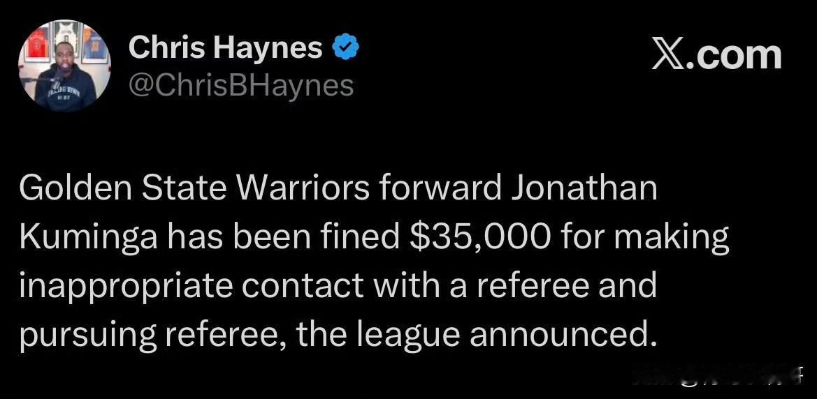 季前赛被罚款!!!库明加因与裁判发生不当接触被罚款3.5万美元! 终究还是逃不掉的,尽管是季前赛,但是NBA对球员和教练之间的挑衅行为还是不可接受的,因此库明加职业生涯首次被驱逐的罚款也到了。 根据记者Haynes最新消息透露,勇士前锋库明加在和开拓者的季前赛第二节最后时刻抱怨裁判,还与裁判发生了不当接触,看来他对裁判的判罚非常不满,并且有持续纠缠的不当行为,最终联盟对他做出了3.5万美元的罚款处罚。 3.5万美元,这可不是小数目了吧,看来库明加今夏休赛期心里还在不痛快,这可是他这么多年第一次做出这样的事情,而且还是季前赛,看来签了大合同不差钱了。 库明加在这次突破中确实身边都是开拓者球员在防守他的突破,他认为对方球员对他犯规了而裁判却视而不见,于是特别生气,下次还是要注意吧。库明加 乔纳森·库明加