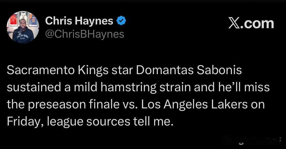 小萨博尼斯腿筋拉伤!!!小萨将缺阵周六对湖人的比赛! 根据记者Chris Haynes最新消息透露,国王队中锋小萨博尼斯遭遇了腿筋拉伤,好在不是很严重,症状属于轻微,他将因此缺席本周六的比赛。 好在是季前赛,好在是不严重,小萨对国王的重要性不言而喻,他是国王队进攻的中轴,能攻能防守能助攻,也是全能型中锋的代表性球员。 新赛季,随着威少的加盟,国王将对新赛季季后赛发起冲击,他们的阵容球星也都有各自的特点,就看主教练的融合能力了。 威少、拉文、德罗赞、小萨、穆雷,如何能够最大化的发挥这些球员的作用,这样的阵容季后赛应该不是问题才对,加油!