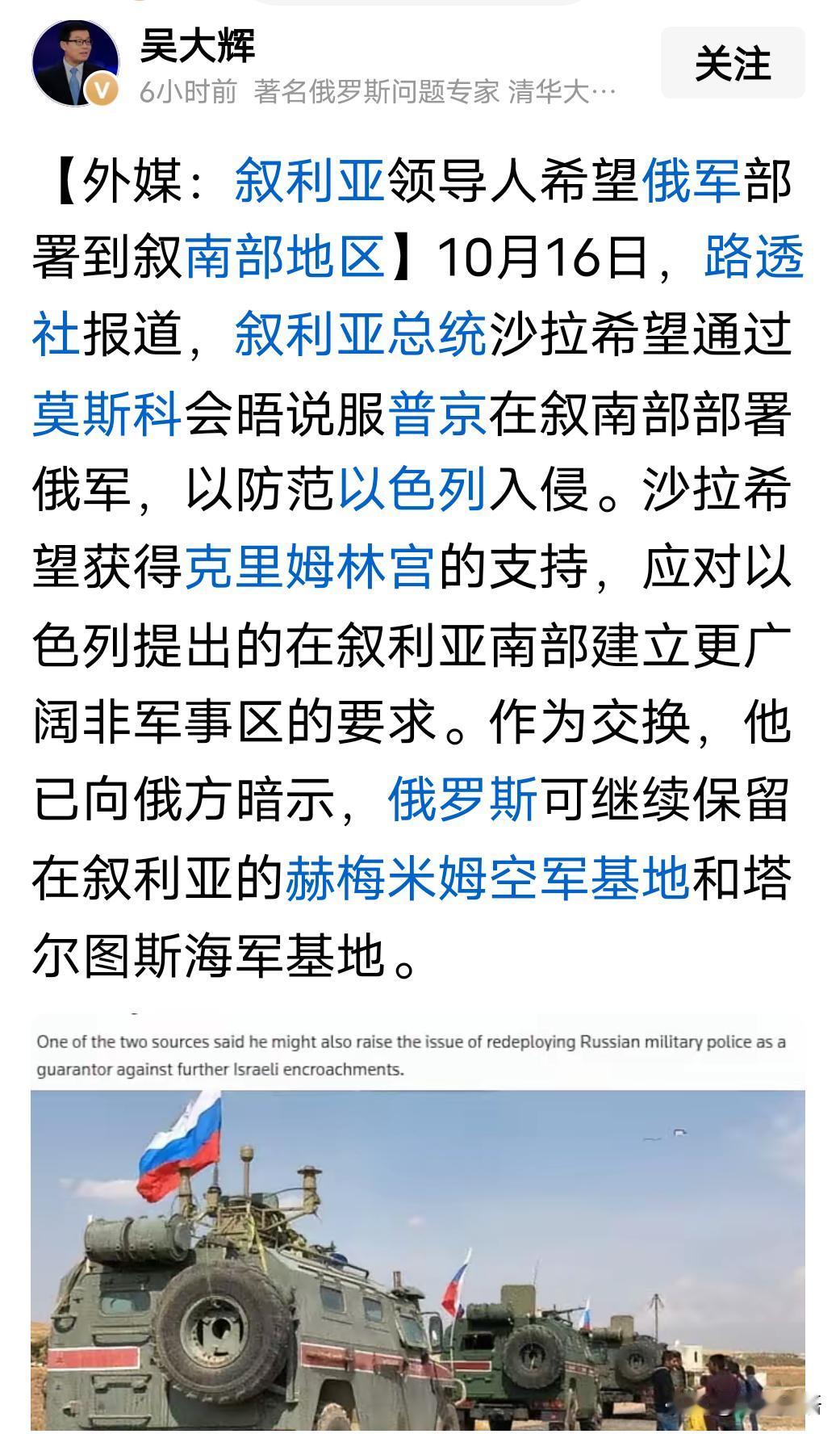 叙利亚总统沙拉希望俄罗斯在叙利亚南部驻军,这是给普京挖了个坑就看他跳不跳了。 请求驻军的理由很简单,就是防御以色列伺机吞并叙利亚,条件也足够诱惑,就是保留俄罗斯在叙利亚的空军和海军基地。 俄乌战争正处在最艰难的时刻,以俄罗斯现在的军事实力是不足以支撑在叙利亚驻军的,况且除了以色列在叙利亚还有美国和土耳其的势力。 如果普京动心了,那驻军的费用叙利亚肯定出不起,作为交换条件是不是还要把阿萨德交出来? 感觉叙利亚背后有高人指点,普京还是不要跳进这个坑……
