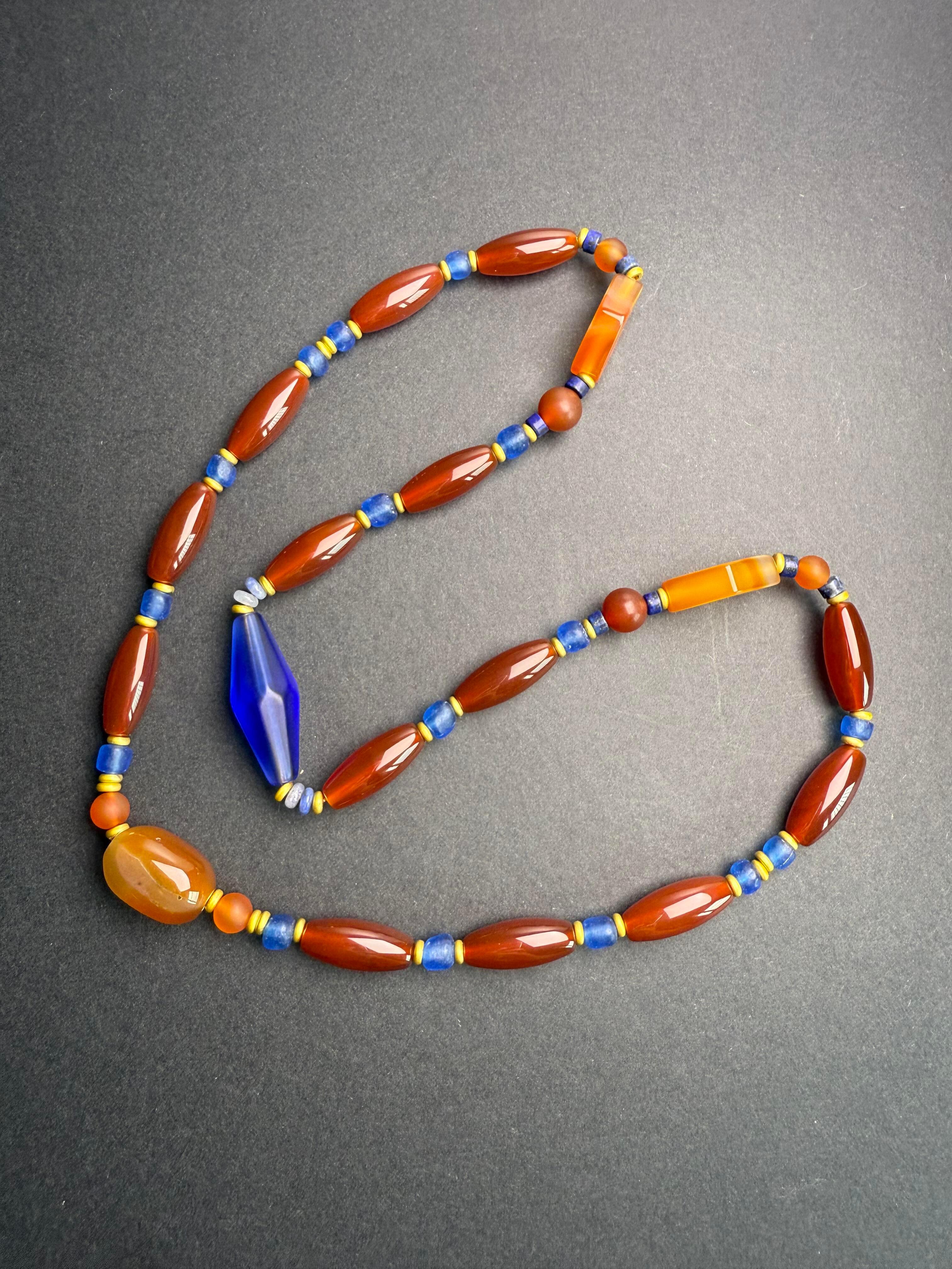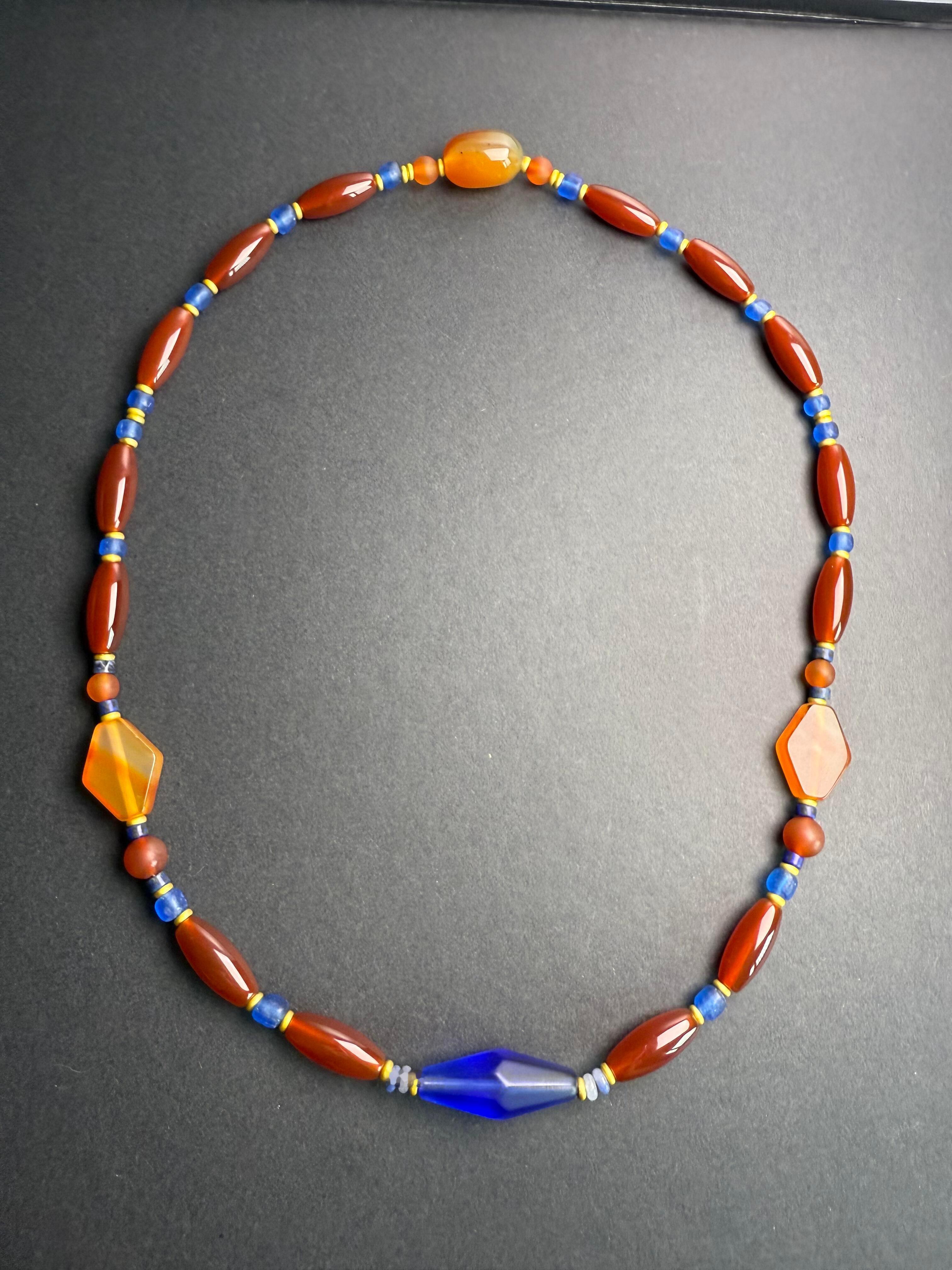 太喜欢这条项链了,红玛瑙+蓝琉璃+黄玛瑙,黄蓝撞色层次丰富,金色隔珠点缀更显复古质感。戴着明艳大气,还有一点民族风的感觉与复古韵味,休闲装、轻礼服都很适配呢。