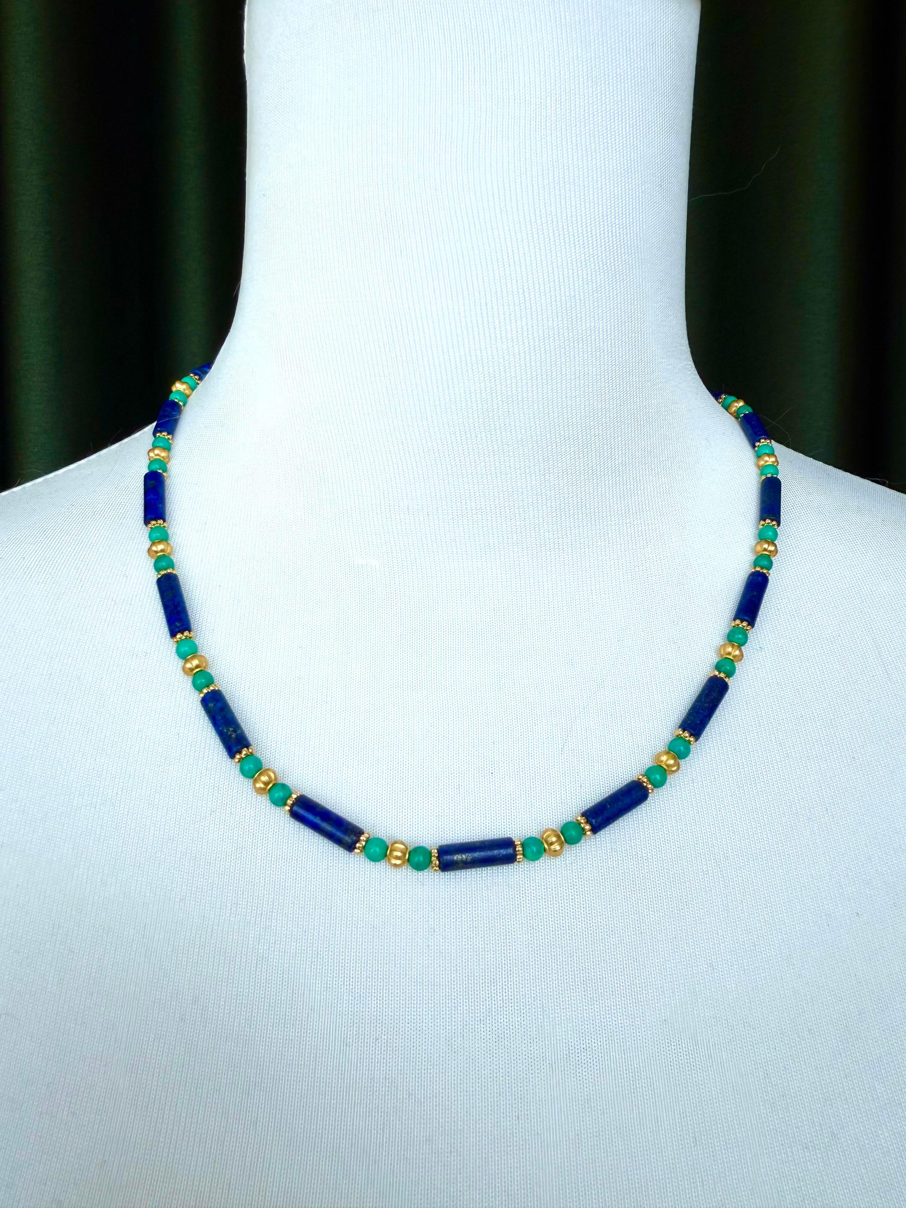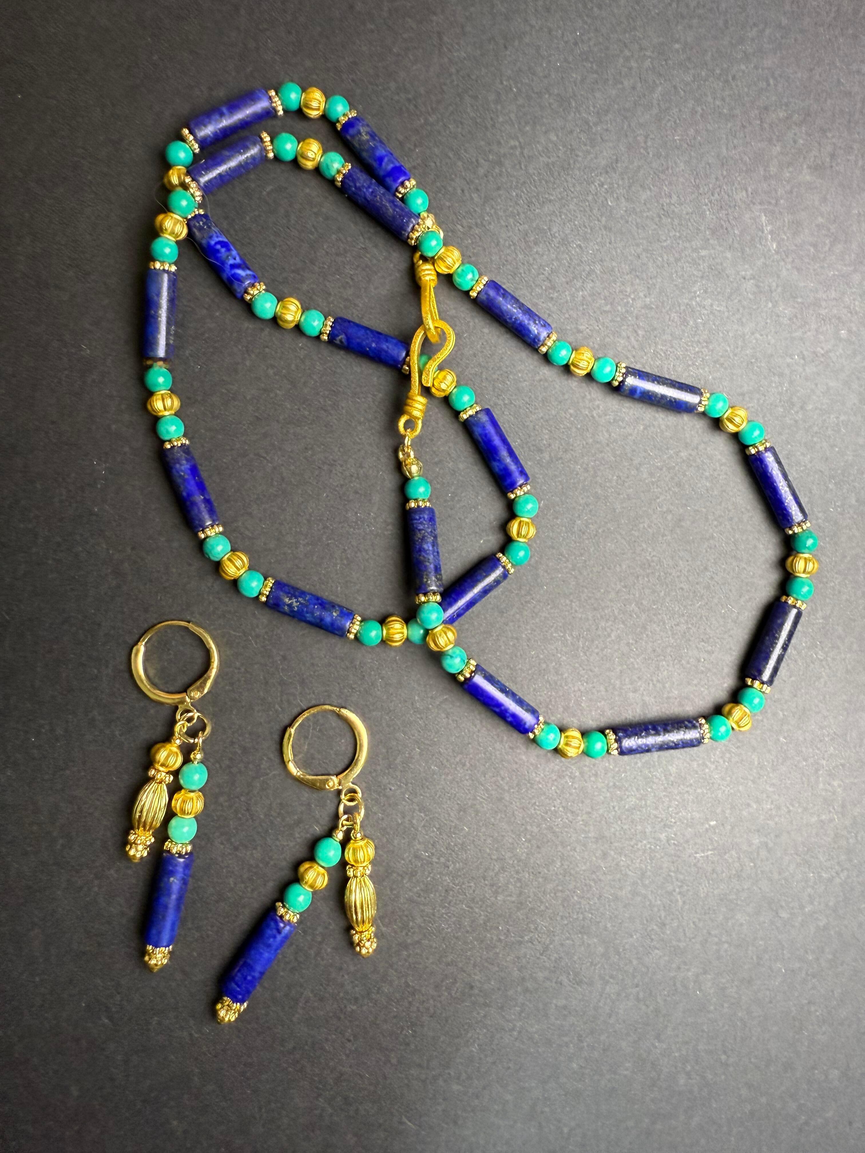 一套“青金石+绿松石+金色”项链、耳环。长条形青金石,搭配圆形绿松石,以金色珠饰、金属件点缀,耳环采用环形耳扣+吊坠设计,看上去复古雅致,色彩撞搭鲜明,又有点小轻奢之感。