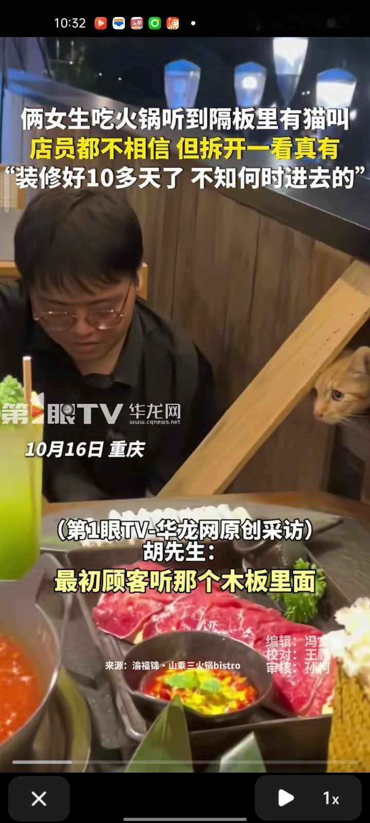 10月16日,重庆。两女生吃火锅时听到隔板有猫叫,店员打开一看还真是。此时的橘猫
