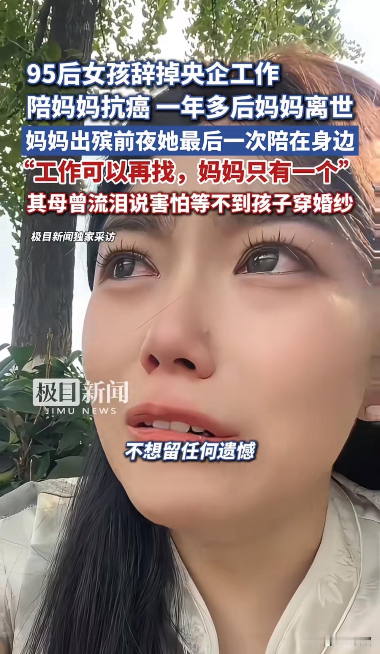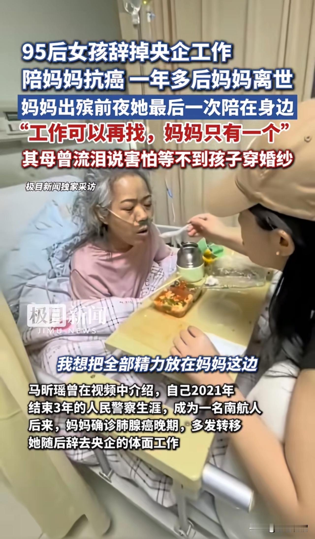泪目!这个女孩的事迹感动了全网! 95后女孩马昕瑶原本是一名空姐。去年三月,她的妈妈被确诊为肺癌晚期,且癌细胞已多处转移。妈妈确诊癌症两个月后,小马辞去了稳定的工作,陪伴妈妈抗癌。 当有人问她是否会后悔辞去工作时,她表示:工作可以再找,妈妈却只有一个。因为妈妈是她生命中最重要的人,为了妈妈,即便付出再大的牺牲,她也心甘情愿,她只想珍惜与妈妈相处的最后时光。 都说“百善孝为先”,马昕瑶做到了。祝愿这个孝顺的女孩未来诸事顺遂、心想事成! (图片来源:极目新闻)