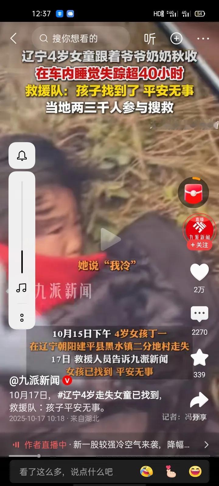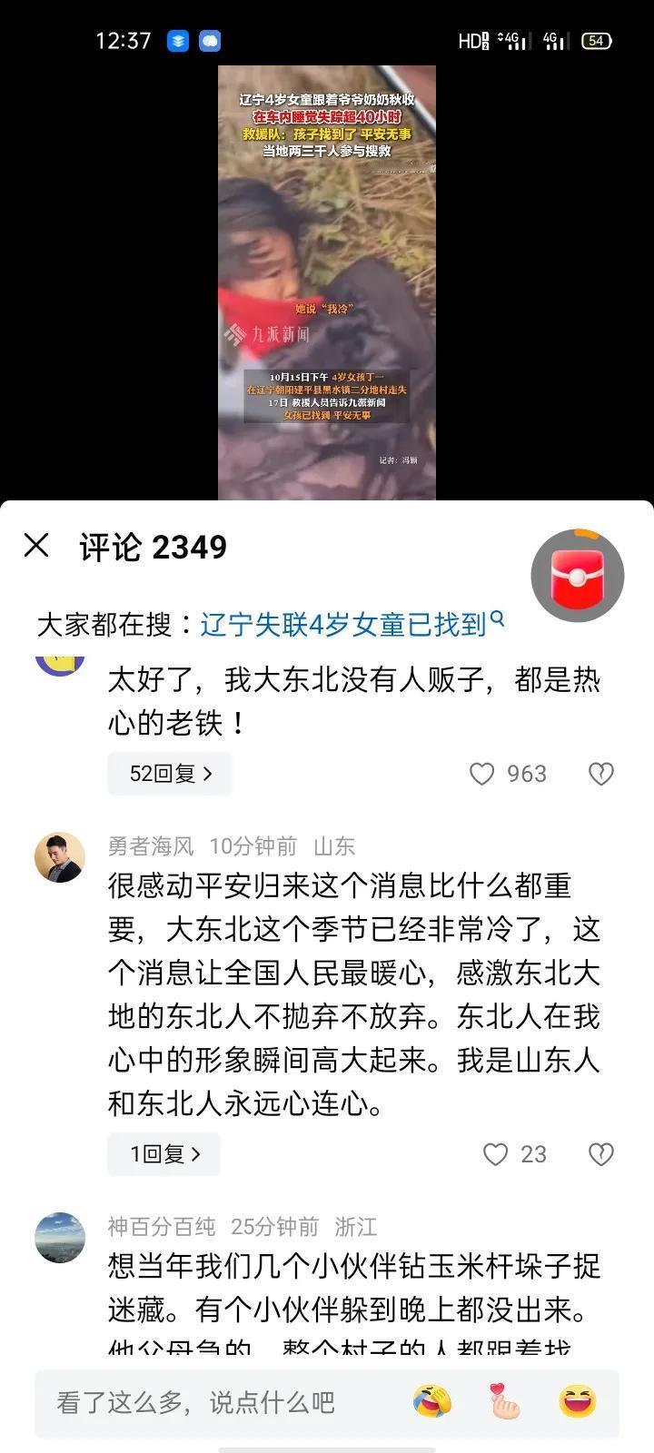 辽宁四岁的小丁一,找到了,孩子安然无恙,自己喊冷。能不冷吗?孩子,东北已经冷了。