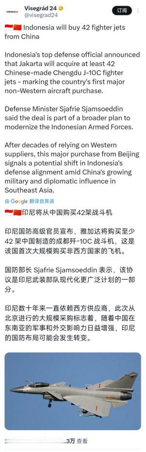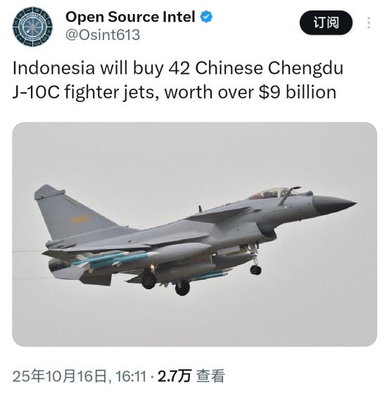 外媒10月16日报道:印尼将购买42架中国成都歼-10C战斗机,价值超过90亿美元。印尼国防高级官员表示,这是该国首次大规模购买非西方国家的飞机。 这个决定背后,藏着印尼空军多年的装备痛点和现实考量,而歼-10C能脱颖而出,靠的不是运气,是实打实的性能优势和体系化解决方案。 先说说印尼过去依赖西方装备时踩过的坑。上世纪80年代买的F-16,现在机龄都超30年了,雷达连超视距探测都费劲,跟现在的空战需求完全脱节。 后来买的俄制苏-30MK性能倒是够格,可跟美国装备体系完全不兼容,每次跟美军搞联合训练都得单独调数据链,折腾半天还不一定顺畅。 最糟的是2022年那笔81亿美元的"阵风"订单,原以为能快速提升战力,结果转头发现达索公司手上压了230多架订单,印尼的"阵风"得排到2026年底才能交货。 更让印尼闹心的是西方装备总爱绑政治条件,前几年美国就因为所谓"人权问题"停供F-16零部件,直接让印尼一半的F-16趴窝半年,连马六甲海峡的防空巡逻都差点断档。 今年9月印尼启动军队重组,总统普拉博沃要搞5个空军快速反应中队,还新设3个空域指挥部,目标就是把1.7万个岛屿的防空网给织起来。这时候对印尼来说,最急需的就是"能立刻用、用得顺"的空中战力。 老F-16跟不上,苏-30兼容性差,"阵风"还在排队等着,歼-10C刚好卡在了这个"急需"的节点上。 而且歼-10C可不是纸上谈兵的花架子,今年5月的印巴空战已经给它打了最好的广告——巴基斯坦空军的歼-10CE一口气应对4架印度阵风战机,凭着有源相控阵雷达和电子战系统的优势,直接让印军战机雷达通信中断,最后只能主动撤退。 更关键的是,巴基斯坦装备的歼-10CE在3月的"雄鹰-IX"演习里,还以3:0击败了欧洲台风战机,这种实战验证过的性能,对印尼来说比任何宣传都管用。 光有性能还不够,性价比才是真能打动印尼的关键。法国阵风单机差不多要2亿美元,可歼-10CE单机才4000到6000万美元,差不多3架歼-10CE才抵得上1架阵风的钱。 要是买42架,歼-10CE总价才33亿美元,印尼90亿的预算里还能省下钱来搞配套设施。后续维护也更省心,中国给的是"按小时付费"的发动机维护模式,一年下来比阵风能省30%。 针对印尼的热带海洋气候,中国还专门做了机体防腐处理,保证出勤率能稳住85%以上,反观阵风在东南亚的平均出勤率也就70%,时不时就得停场检修。 印尼要的不只是一架好飞机,是一整套能立刻用起来的防空体系。中国直接把歼-10CE和ZDK-03预警机、红旗-9P防空系统打包送上门,数据链直接打通,不用像阵风那样买了飞机还得额外掏钱适配其他装备。 法国那边只肯卖单机,后续的配套系统得另算钱,这对想尽快形成战力的印尼来说显然不划算。印尼副防长就直言,"歼-10在印巴冲突中的体系化表现是重要考量因素",毕竟现代空战早就不是单机对决了,是整个作战体系的较量。 这次军购还有个耐人寻味的背景,就是印度阵风的实战翻车彻底砸了招牌。今年5月7日的印巴空战里,印度的阵风战机因为没法接入俄制预警机系统,成了"没眼睛的孤鸟",被巴军歼-10CE击落3架,其中编号001的还是印度2020年接收的首架阵风。 法国一开始还想甩锅说"是印度操作不当",结果被戳穿是体系不兼容的问题——这刚好是印尼最担心的隐患。这场空战后,沙特、塞尔维亚这些原本想订阵风的国家全暂停了谈判,印尼自然也不想再踩这个坑。 从更大的视角看,印尼选歼-10C其实是顺应了军购市场的新趋势。现在军购早就不是"看牌子"的年代了,对中小国家来说,"好用、不贵、能快速融入体系"才是硬指标。中国武器出口这些年能打开局面,靠的就是这种务实态度。 不像西方动不动就搞技术封锁和政治附加条件,中国给印尼的不只是战机,还有平等合作的尊重。比如针对印尼的岛屿防空需求,中国还愿意提供定制化的训练方案,帮印尼飞行员快速掌握歼-10C的操作技巧,这种"交钥匙工程"式的服务,正是印尼急需的。 更重要的是,这次军购打破了西方对先进战机市场的垄断。过去说起主力战机,好像就只有美俄欧的产品可选,但歼-10C的出现证明,非西方国家照样能造出顶用的先进武器。 现在再回头看,印尼选歼-10C根本不是偶然。当西方装备还在比拼牌子和价格时,中国已经摸到了现代军购的核心——解决客户的真实痛点。从实战验证的性能,到性价比的优势,再到体系化的配套服务,歼-10C每一项都踩中了印尼的需求。
