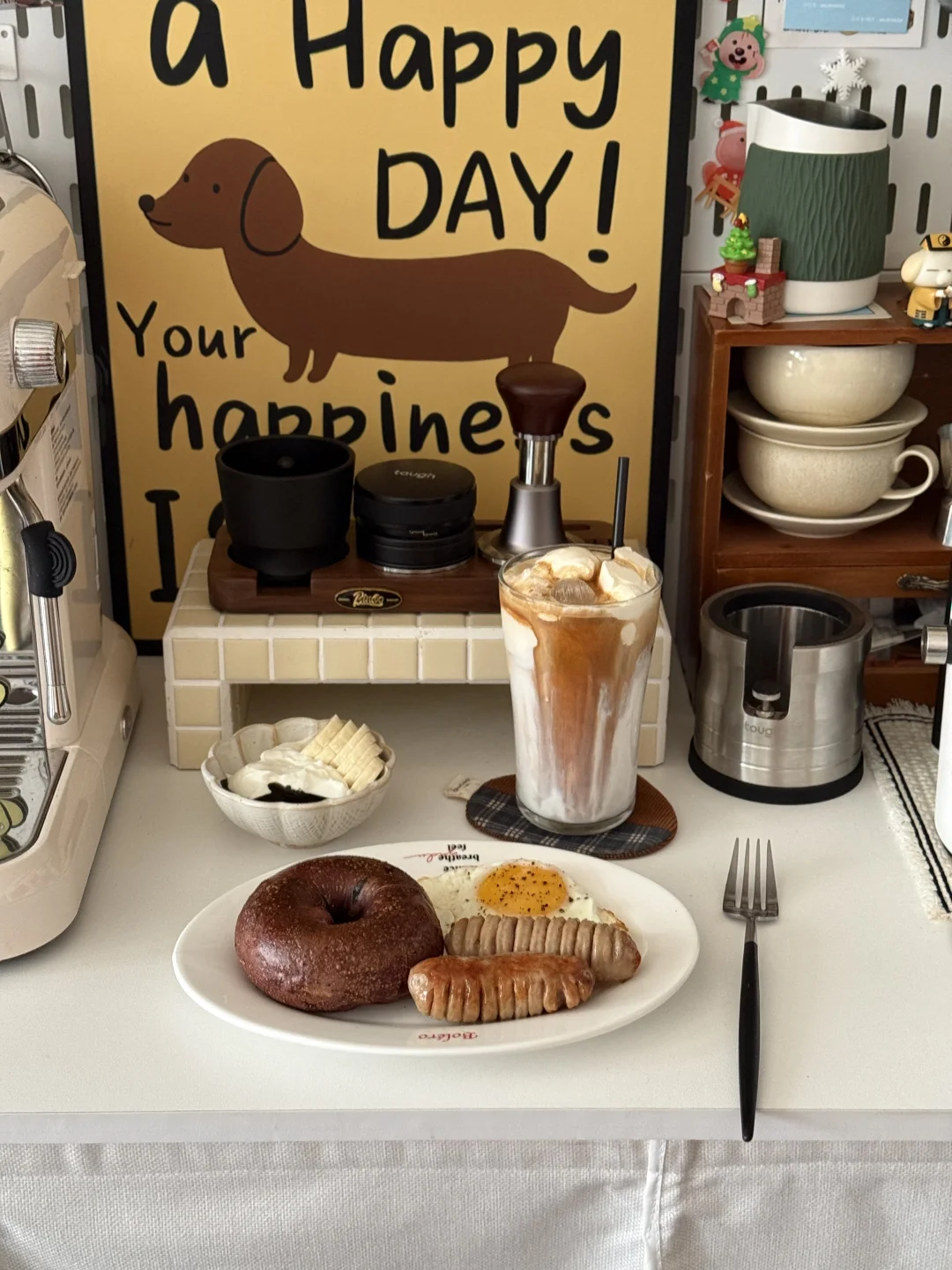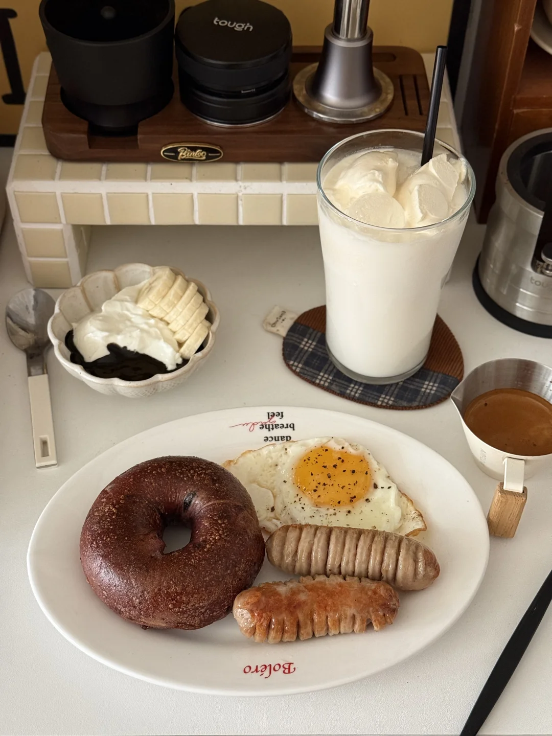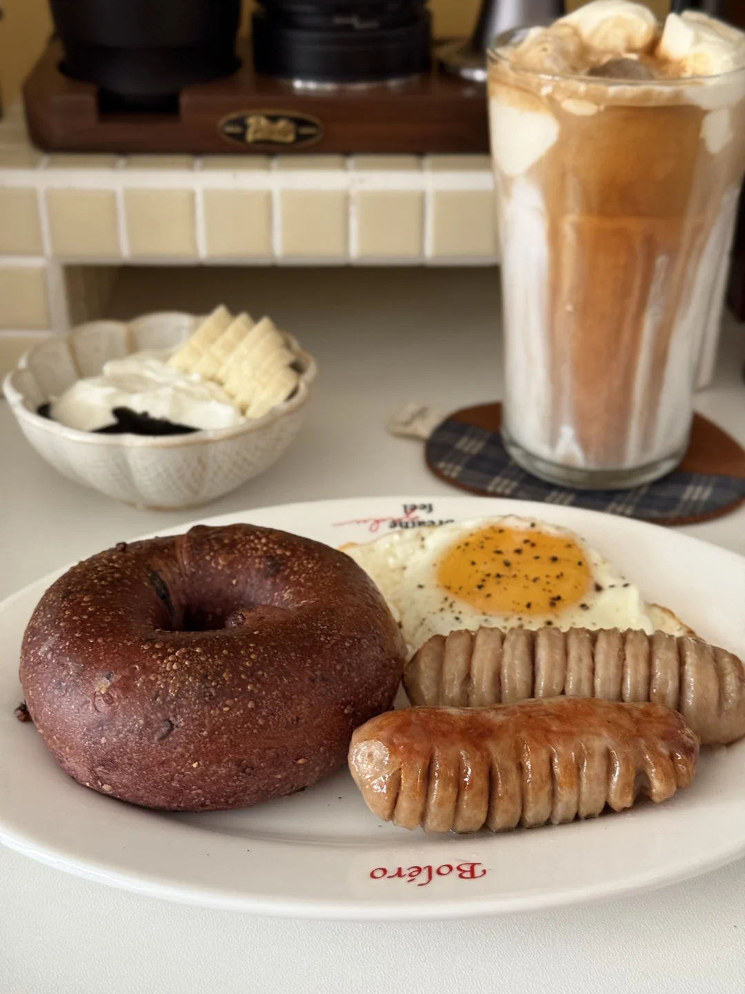 感觉就是莓果味的贝果[得意R] 复烤之后还挺好吃的 - 今日早餐🥣 - ▪️黑醋栗贝果|烤肠🍳|黑芝麻香蕉酸奶|冰淇淋拿铁 - 这几天还是热的不行🙂↔️ 又是靠冰咖降温[暗中观察R]