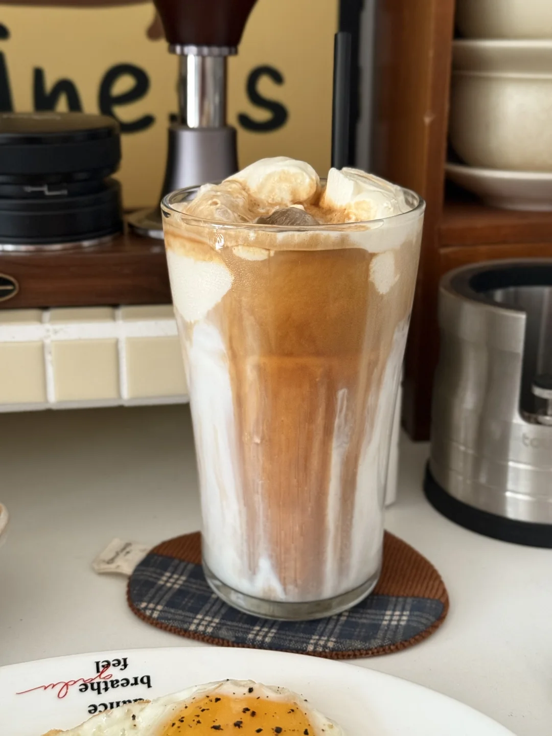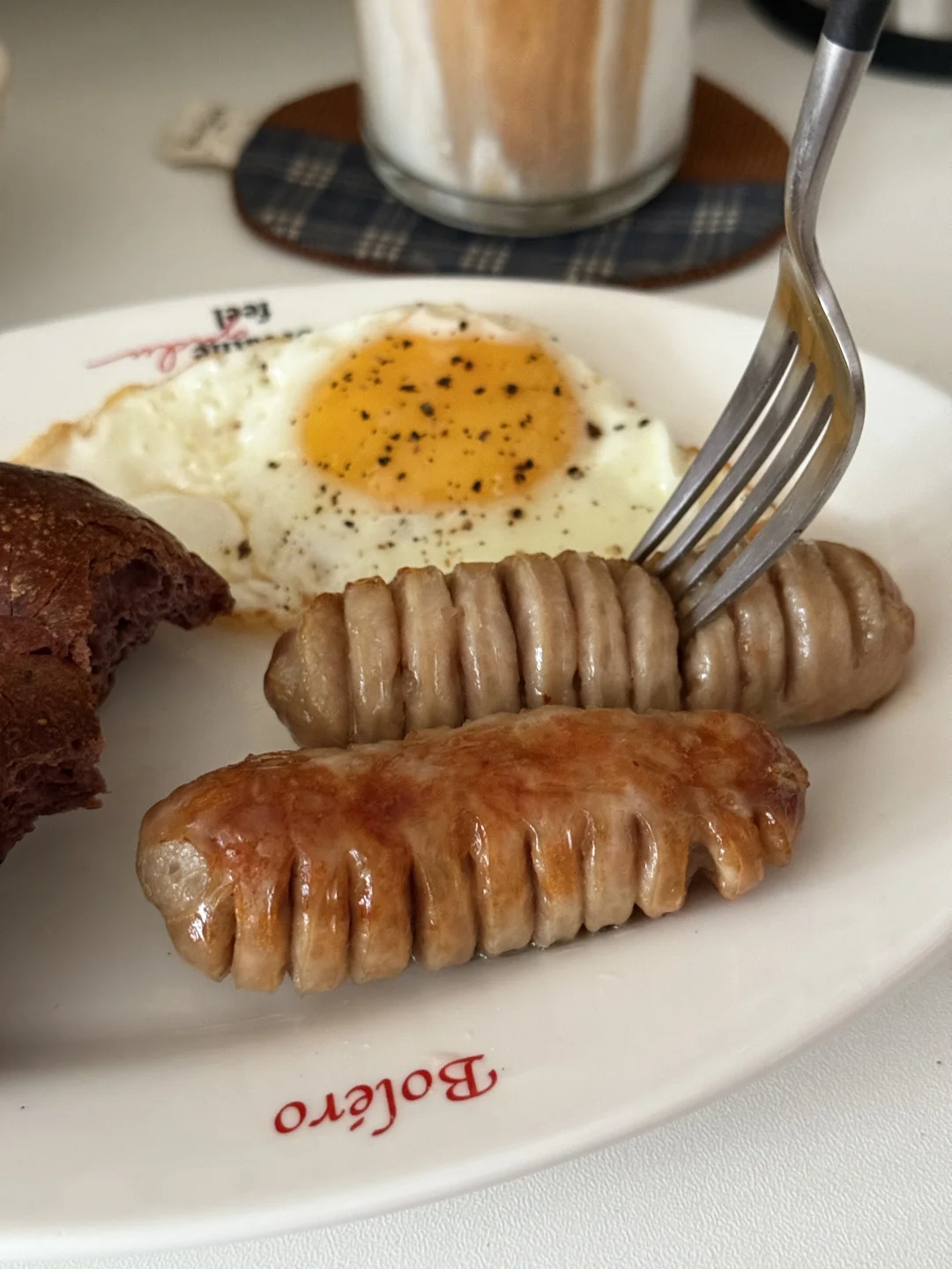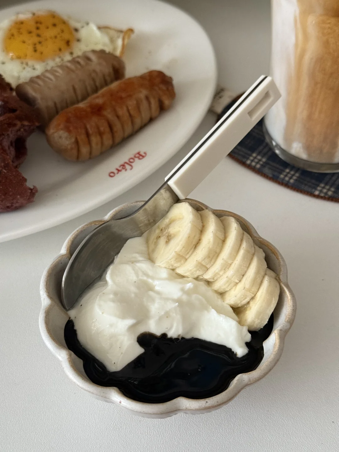 感觉就是莓果味的贝果[得意R] 复烤之后还挺好吃的 - 今日早餐🥣 - ▪️黑醋栗贝果|烤肠🍳|黑芝麻香蕉酸奶|冰淇淋拿铁 - 这几天还是热的不行🙂↔️ 又是靠冰咖降温[暗中观察R]