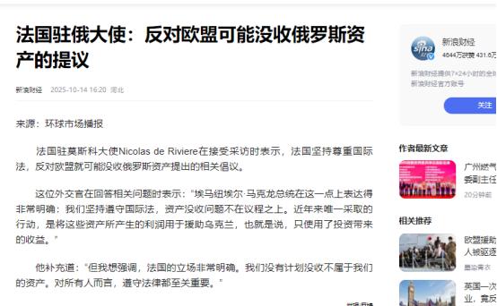 法国做出了正确选择。法国驻俄罗斯大使尼古拉·德里维埃10月14日表示,法国反对没收欧盟境内俄罗斯资产的想法,“我要再次强调,法国的立场是明确的。我们绝不会谈论没收不属于我们的资产。重要的是,所有行动都必须严格遵守法律。”   这可不是法国突然心血来潮,而是马克龙政府深思熟虑后的结果。毕竟欧盟现在冻结着俄罗斯央行大约2000亿欧元的资产,其中大部分就存放在布鲁塞尔。这么一大笔钱摆在眼前,谁不眼红?但法国心里清楚,动这笔钱的后果可比想象中严重得多。   先从法律层面来说,没收主权国家的资产在国际法上根本站不住脚。俄罗斯央行的这些资产属于国家储备,按照国际惯例,其他国家无权随意处置。法国作为欧盟的重要成员国,一直标榜“法治”和“规则”,要是带头违反国际法,以后还怎么在国际舞台上混?   更关键的是这种行为一旦开了先例,全球金融体系的信任基石就会被撼动。其他国家会想,今天你能没收俄罗斯的资产,明天是不是就轮到我了?到时候大家谁还敢把钱存在欧洲?欧元的国际地位说不定就因此一落千丈。   再看看欧盟内部的情况,各国的态度也是五花八门。波兰、立陶宛这些东欧国家,因为离俄罗斯近,整天担惊受怕,一门心思地想把俄罗斯的资产拿过来支援乌克兰。   但德国、比利时这些国家就没那么激进了。德国持有不少俄罗斯的资产,担心一旦没收,俄罗斯会通过法律手段报复,到时候德国的银行可能得赔个底朝天。比利时更直接,欧盟冻结的俄罗斯资产有九成以上都存放在他们那里,真要动了本金,俄罗斯第一个就会把比利时告上国际法庭。比利时首相德克罗早就放话了,要动这笔钱也行,得先签个“共同责任协议”,以后出了事大家一起扛。可欧盟那么多国家,谁愿意平白无故地背这个锅?   其实欧盟也不是完全没动过俄罗斯资产的主意,他们一开始只是用这些资产产生的利息和收益来资助乌克兰,这样做风险相对小一些。比如2025年上半年,欧盟就向乌克兰划转了101亿欧元的利息,还以这些利息为担保,给乌克兰提供了500亿美元的贷款。   但乌克兰就像个无底洞,前线每个月要花50亿美元的军费,战后重建更是需要5240亿美元。靠那点利息根本不够塞牙缝的。于是欧盟开始打起了本金的主意,提出要把1400亿欧元的冻结资产变成无息贷款给乌克兰。但这种做法说白了就是“用俄罗斯的钱打俄罗斯”,俄罗斯能答应吗?   俄罗斯的态度也很明确,谁敢动他们的资产,就跟谁死磕到底。普京早就签署了法令,授权国有银行接管西方在俄罗斯的资产,总额估计有1800亿欧元,德国和法国的企业首当其冲。   要是欧盟真的没收了俄罗斯的资产,俄罗斯肯定会以牙还牙,到时候法国在俄罗斯的企业可就遭殃了。而且俄罗斯还警告,如果西方继续一意孤行,他们不排除和美国断交。这种情况下,法国还敢轻举妄动吗?   其实法国的反对也不是没有道理,马克龙心里清楚,欧盟现在的当务之急不是和俄罗斯彻底撕破脸,而是想办法在不引发更大冲突的前提下解决乌克兰问题。如果真的没收了俄罗斯的资产,俄乌冲突只会越演越烈,到时候欧洲可能会被彻底拖进战争的泥潭。再说了,法国和俄罗斯之间还有不少经济往来,法国的企业在俄罗斯也有不少投资。要是关系闹僵了,法国的经济也会受到影响。   更重要的是,法国作为欧盟的核心成员国,需要维护欧盟的团结和稳定。如果因为没收俄罗斯资产的问题,欧盟内部出现严重分歧,甚至导致欧盟解体,那法国可就得不偿失了。马克龙一直致力于推动欧洲一体化,他可不希望因为这件事让自己的努力付诸东流。   当然法国的反对也不是完全没有阻力,法国国民议会里就有不少议员支持没收俄罗斯的资产,他们认为这是支持乌克兰的“正义之举”。但法国政府很清楚,这种做法虽然能一时赢得民心,但从长远来看,对法国和欧盟都没有好处。所以马克龙政府一直顶住压力,坚持自己的立场。   总的来说法国反对没收俄罗斯资产的决定是明智的。这不仅是对国际法的尊重,也是为了维护欧盟的团结和稳定,更是为了保护法国自身的利益。   在这个复杂的国际局势下,法国没有被短期的利益冲昏头脑,而是做出了符合长远利益的选择。这种冷静和理智,值得其他国家学习。   希望欧盟能听取法国的意见,在处理俄罗斯资产的问题上保持克制,避免做出让自己后悔的决定。毕竟,战争已经让欧洲伤痕累累,经不起更多的折腾了。   来源:新浪财经【法国驻俄大使:反对欧盟可能没收俄罗斯资产的提议】