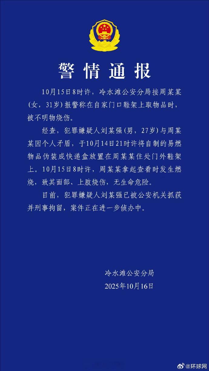 经查,犯罪嫌疑人刘某强(男,27岁)与周某某因个人矛盾,于10月14日21时许将自制的易燃物品伪装成快递盒放置在周某某住处门外鞋架上。10月15日8时许,周某某拿起查看时发生燃烧,致其面部、上肢烧伤,无生命危险。目前,犯罪嫌疑人刘某强已被公安机关抓获并刑事拘留,案件正在进一步侦办中。