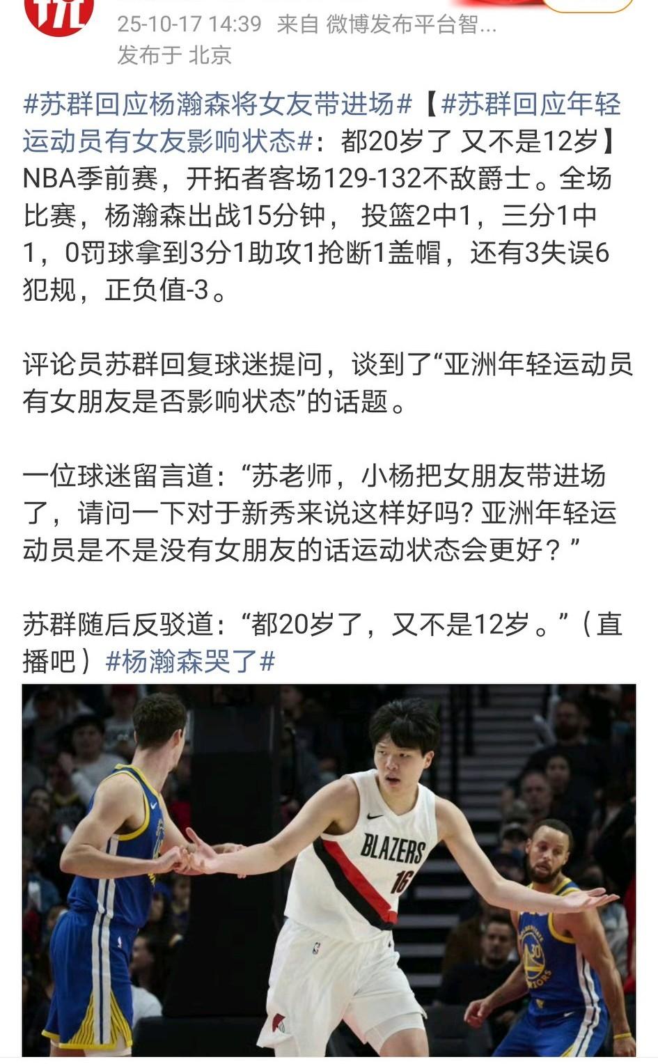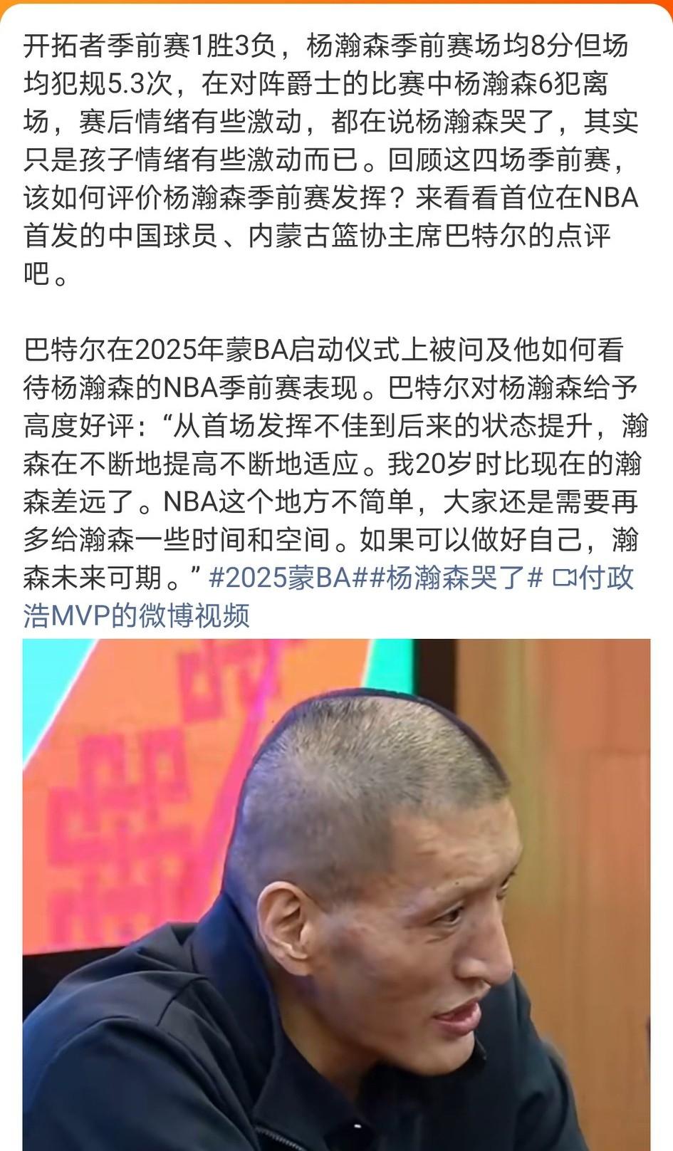 最后一场季前赛,开拓者对阵爵士,杨瀚森6犯离场,仅得到3分1助1帽1断。但令人印象深刻的是另外两件事: 1、带女朋友进场,网友说影响了他的状态。但苏群老师的回应很惊人。 2、六犯离场后,杨瀚森情绪崩溃哭了。他自己说:情绪比较激动确实打得不好,掉了几颗眼泪问题不大。 图五:巴特尔主席评价杨瀚森的季前赛表现。
