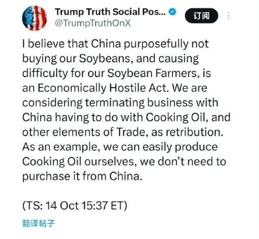 特朗普又发话了,不买大豆就禁运食用油!特朗普又发文称如果咱们不购买美国的大豆,那么美国也将会不会购买咱们的食用油,改为使用美国用自己生产的食用油。 话说这事儿又闹起来了,特朗普这家伙一上台就爱折腾贸易,2025年10月14日,他在自己的Truth Social平台上发了个帖,直指中国不买美国大豆是“经济敌对行为”,还扬言要切断包括食用油在内的贸易往来,说美国自己就能搞定食用油生产,不用靠进口。听起来挺狠的,但细一琢磨,这招儿对中美贸易的冲击其实小得可怜。咱们一步步来捋捋,这背后的弯弯绕绕,暴露了不少问题。 先说说特朗普这帖子的来龙去脉。从今年5月开始,中国就没再从美国进口过一粒大豆,这不是头一回了。回想2018年那场贸易战,中国本来是美国大豆的最大买家,占了美国出口的近六成,价值上百亿美元。可关税一加,中国立马转向巴西和阿根廷,巴西大豆产量蹭蹭上涨,成了新宠。现在2025年,情况差不多,美国中西部豆农的库存堆积如山,价格跌了15%,仓库里豆子都快发霉了。特朗普一看自家农民叫苦,就急眼了,发帖说中国这是故意整人,得报复回去。结果呢,他挑的食用油这张牌,压根儿没啥杀伤力。 为啥这么说?因为美国从中国进口的所谓“食用油”,其实大部分是废旧油脂,占比不到0.3%。这些东西在美国不是用来炒菜的,而是加工成生物柴油和可再生航空燃料,帮着环保减排。彭博社的数据显示,今年中国对美出口的加工油品已经下滑43%,早就是鸡肋了。美国本土大豆油产量本来就占全球一半多,自给率99%以上,超市货架上到处是本地品牌,进口这点玩意儿算啥?特朗普说“我们自己就能生产”,这倒没错,但他忽略了事实:禁了也没人当回事儿。中国这边,食用油市场大得很,转头买巴西的就行,不会饿肚子。反过来,美国豆农的损失可不是小数目,去年光补贴就砸了上百亿,还得继续掏腰包。 这事儿搁谁身上都得想想根儿在哪儿。特朗普上台后,重拾保护主义老路,关税壁垒一层层加,声称是为美国工人好。可现实是,贸易战打到现在,美国消费者多掏了上千亿关税钱,通胀推高了物价。豆农们表面上拿补贴,心里明白,这不是长久之计。欧盟、日本这些市场运费高,竞争也猛,巴西的豆子又便宜又稳。特朗普的帖一发,华尔街反应平平,道琼斯指数只跌了0.2%,大豆期货晃悠了两天就稳住了。交易员们私下嘀咕,这不过是场秀,市场早习惯了这种噪音。 中国外交部的回应也挺稳当,10月15日发言人表态,说对美方单边措施表示遗憾,贸易问题得通过平等对话解决,别搞对抗。商务部那边也没闲着,数据显示,今年前三季度,中国大豆进口总量超8000万吨,其中巴西占了七成多,阿根廷紧随其后,美国份额直奔零。中国企业早就调整供应链,港口里巴西货轮排队卸货,效率高多了。这不光是经济账,还牵扯到全球粮食安全。大豆这东西,不止喂猪,还做饲料、油料,价格一波动,全球通胀就跟着颤。联合国粮农组织早警告过,贸易壁垒会放大风险,尤其对发展中国家。 再深挖挖,这威胁背后其实是美国农业政策的尴尬。特朗普第一任期时,就签过中美第一阶段协议,中国承诺多买美国农产品,可执行起来磕磕绊绊。拜登接手也没管好,现在特朗普卷土重来,还想重温旧梦。可时代变了,中国经济体量大了,进口来源多元了,不再把鸡蛋全搁一个篮子。巴西的转基因大豆技术牛,产量年年破纪录,阿根廷的土壤肥沃,成本低。相比之下,美国豆农面临劳动力短缺、气候变化,成本居高不下。补贴能救一时,救不了一世。国会山上的农业委员会天天开会,游说团塞报告,呼吁拨款20亿援助,可钱从哪儿来?关税收入?那不还是从美国老百姓兜里掏的。 从全球看,这事儿也敲响警钟。WTO规则本该管这些,可美国带头退群,单边主义横行,其他国家学着点,贸易碎片化加剧。发展中国家进口成本涨,穷国更买不起粮食。想想非洲那些靠大豆饲料养牲口的农民,价格一高,饭碗就砸了。中国这边,稳扎稳打,推动RCEP和“一带一路”,供应链更韧性。巴西总统卢拉乐坏了,出口订单爆满,经济数据亮眼。阿根廷也跟着沾光,外汇储备涨了20%。反观美国,农民协会在芝加哥开新闻会,主席直摇头,说短期是噪音,长远得谈协议。 总的来说,这大豆油风波,不过是中美博弈的冰山一角。特朗普爱玩火,可火烧不着别人,先燎了自己脚。豆农们还得等补贴,中国企业继续挖潜巴西,美国消费者继续埋单。贸易这东西,说到底是互利共赢,单干没好果子吃。希望下回谈判,能多点理性,少点秀肌肉。毕竟,全球就这么大,大家挤一块儿过日子,总得讲点规矩。