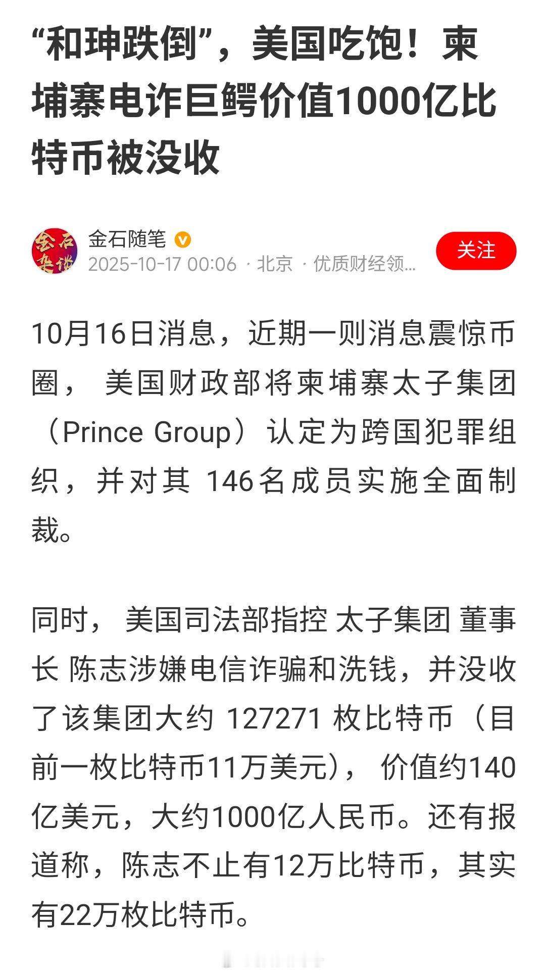 “和珅跌倒”,美国吃饱!柬埔寨电诈巨鳄价值1000亿比特币被没收。
