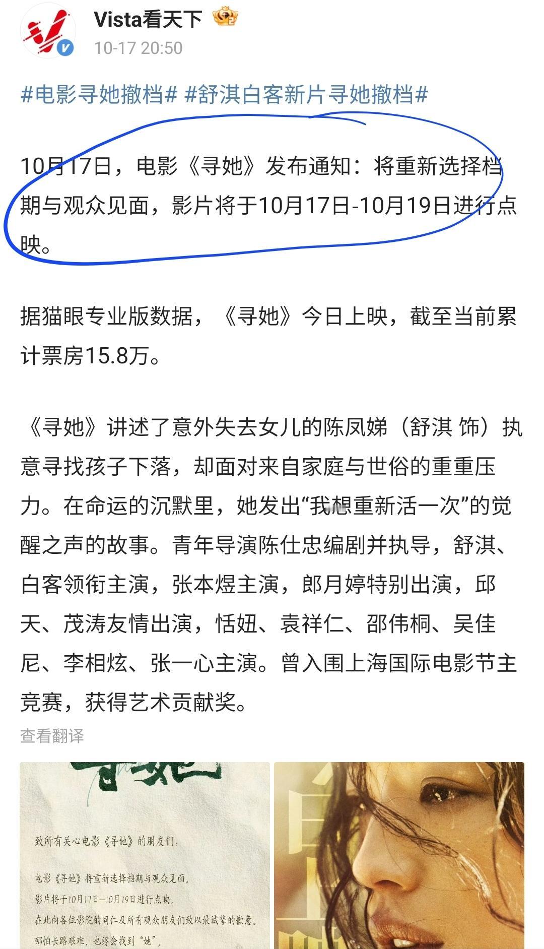 吃了题材的亏 舒淇和白客主演的电影寻她撤档了,撤档的原因虽然没说,但是从票房上能