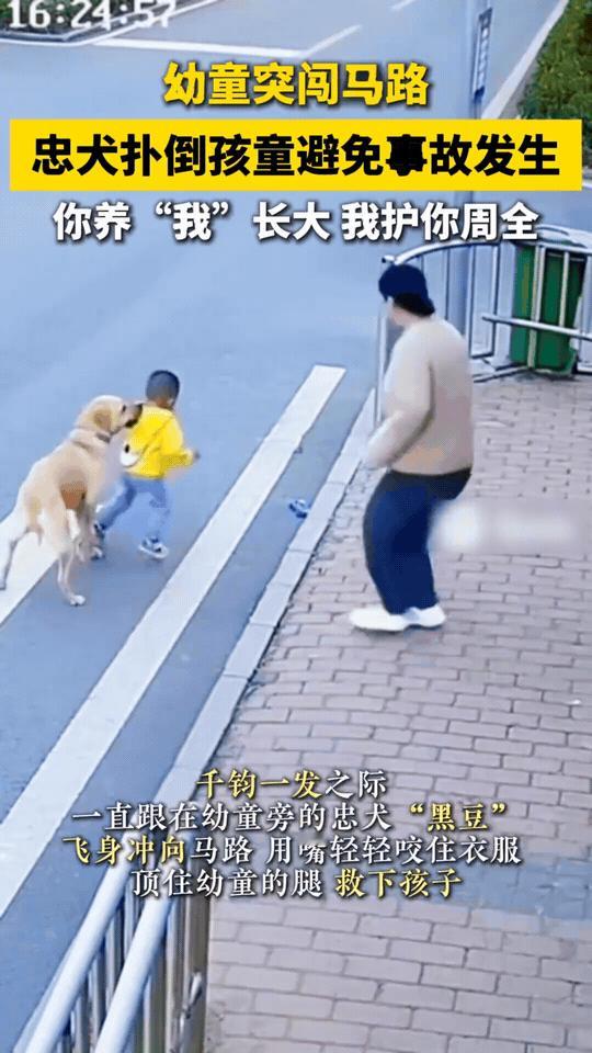 “你养我长大,我护你周全”!2025年10月11日,北京街头发生了一幕惊险而又温暖的事件。一名幼童在路边玩耍时,突然毫无预兆地冲向马路,此时一辆白色轿车正飞速驶来,与男孩的直线距离已不足十米,司机根本来不及将车完全刹停,只能拼命按响喇叭发出警示。 千钧一发之际,一直跟在幼童旁的忠犬“黑豆”迅速反应,如同离弦之箭般飞身而出,用嘴轻轻咬住男孩的衣角,同时用身体巧妙地顶住孩子的腿,将他成功从车轮边拉了回来,一场可能发生的严重事故得以避免。 据报道,这只狗是半年前小宝在村口捡到的流浪狗,自那以后,它便与小宝形影不离,此次更是奋不顾身地保护了小宝的安全。事件发生后,“黑豆”的英勇行为在网络上引发热议,网友们纷纷为这只忠犬点赞,称赞它是“守护天使”,用行动诠释了忠诚与爱。