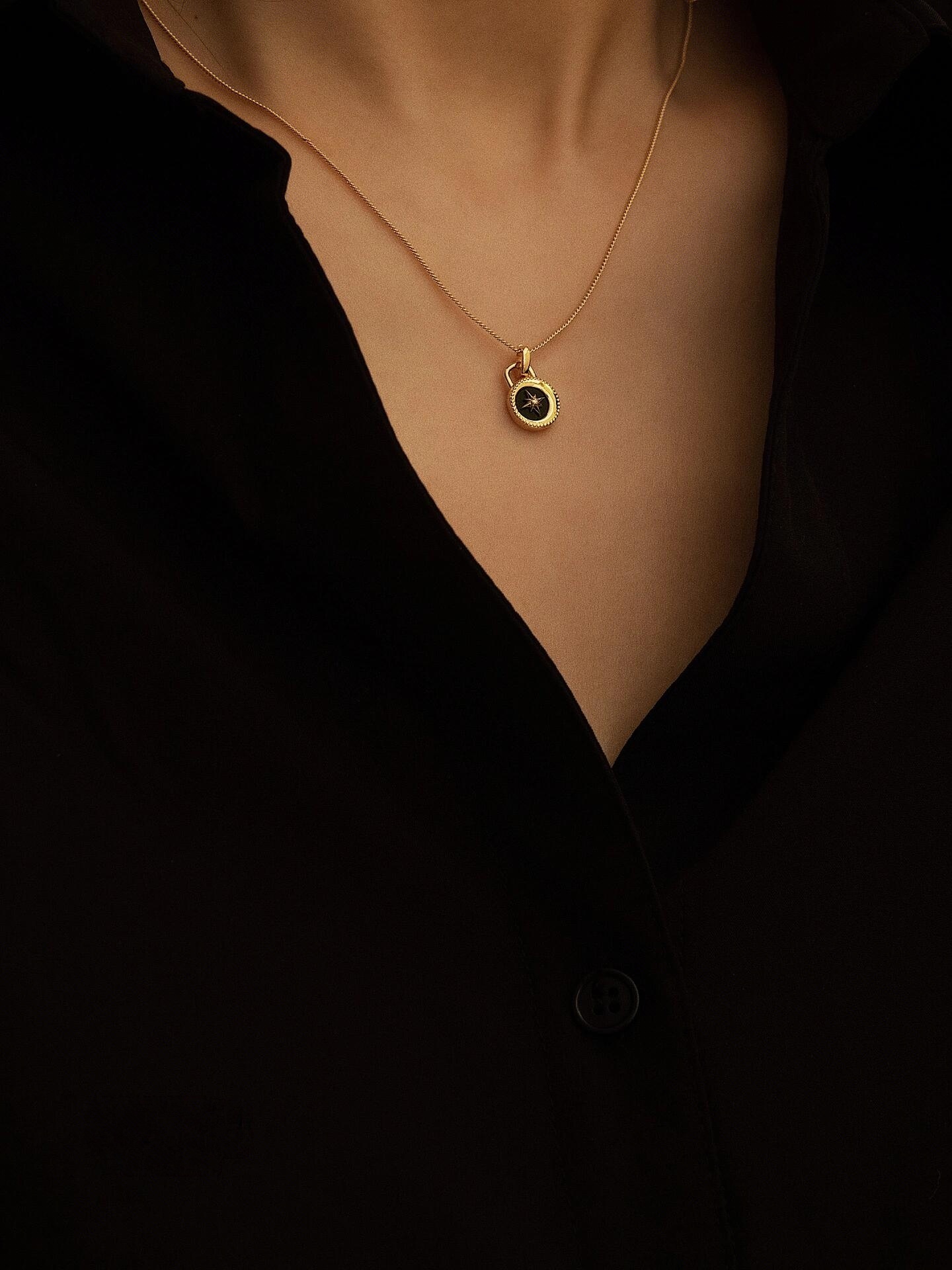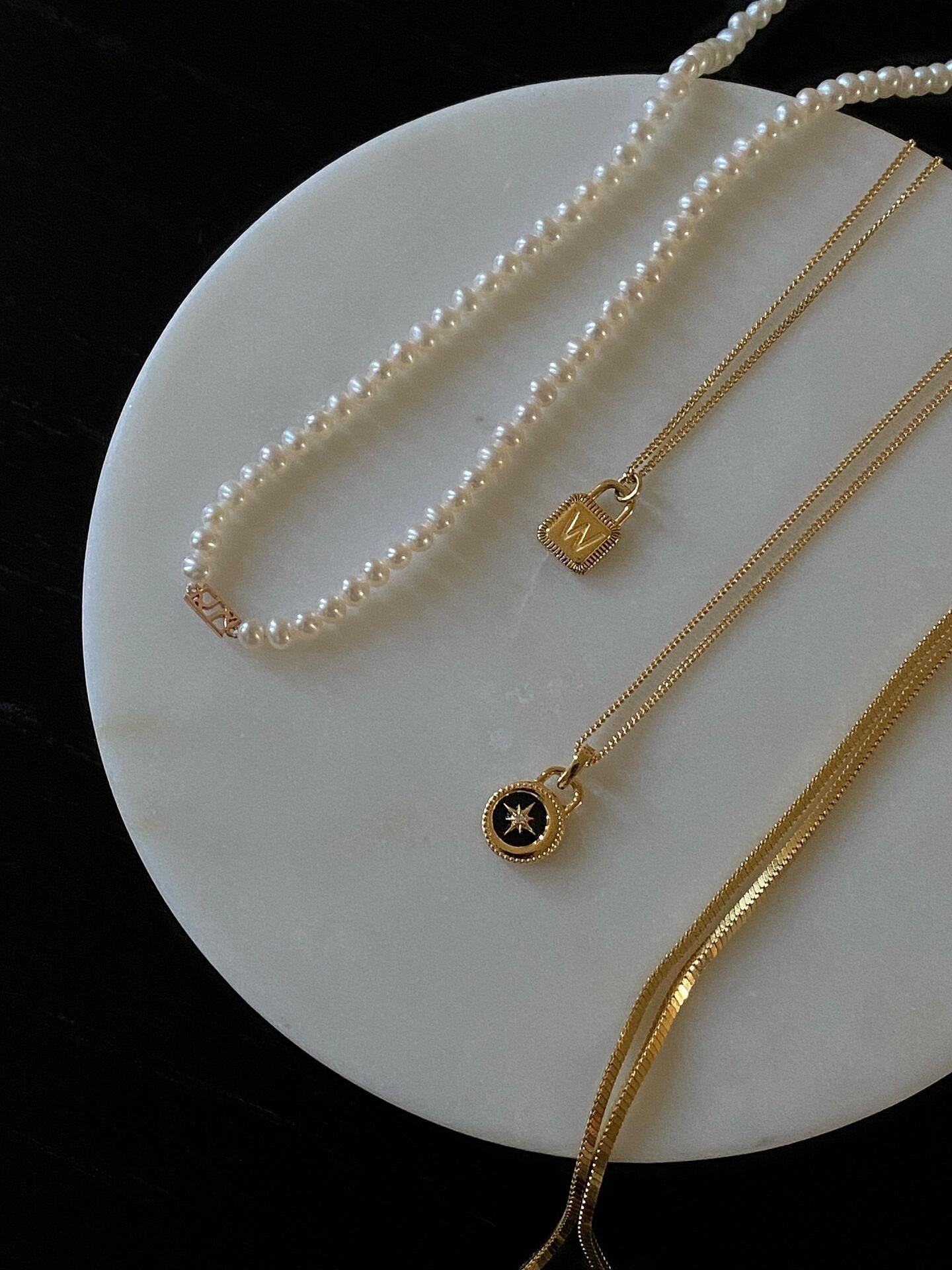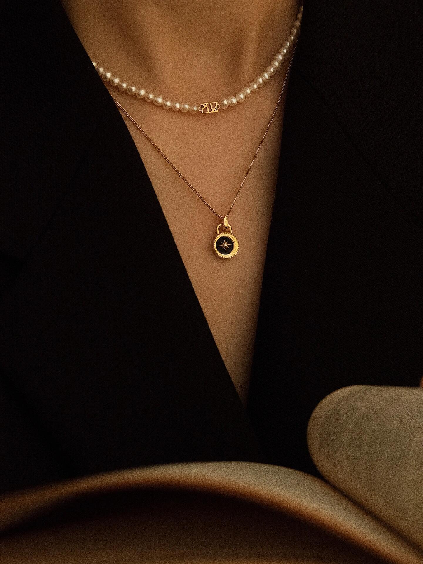 经探索发现,小直径珍珠与黑金的搭配堪称绝妙组合,适配场景极为广泛。珍珠锁骨链长度略长于普通 choker,大小恰到好处,既显大方又不失青春活力,中间点缀小巧别致的 logo,无需完美脖颈线条,也能轻松戴出美感。追光项链以黑玛瑙为底,搭配六芒星与月亮造型,与珍珠光泽相互辉映,叠戴效果美轮美奂。