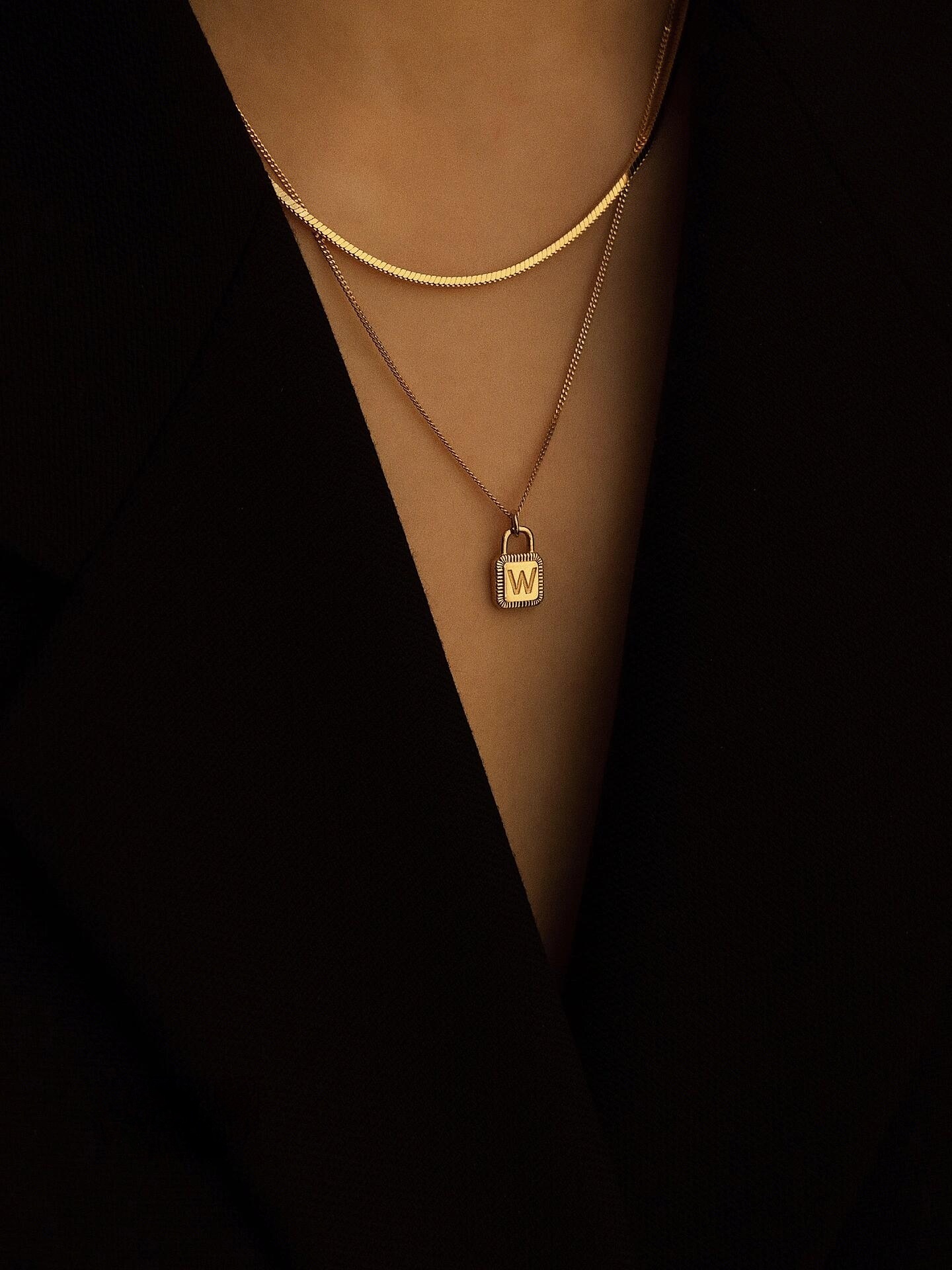 若偏爱暖金色调,蛇骨链与字母锁项链的叠戴则是经典之选。方形蛇骨链较扁平款更具厚重感,契合秋冬氛围。字母锁项链可镌刻亲人名字首字母,佩戴时暖意涌上心头,让时尚与温情完美交融。秋日仪式感配饰这配饰有点人设在身上