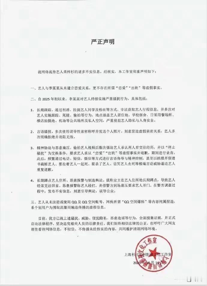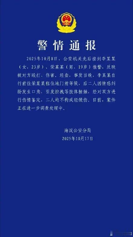 荣梓杉和李禹熹两位小明星因感情纠纷互殴,后来又都报警要求刑事拘留对方,结果警方调查两人都受伤太轻不能构成轻微伤,最多就是行政拘留,具体情况还在进一步调查。 此前其工作室还发布辟谣称两人没有感情纠纷。 荣梓杉恋情 李禹熹
