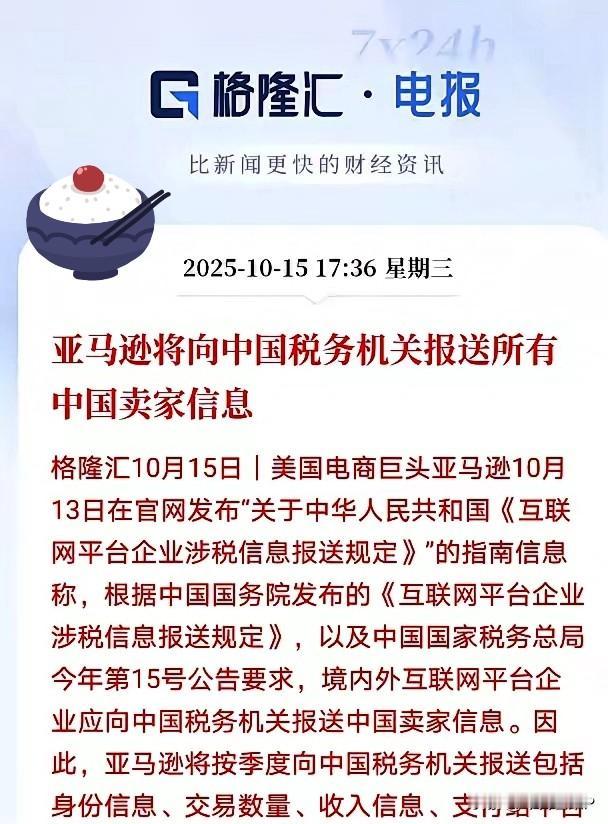 亚马逊突然向全球中国卖家发出通知,要求10月31日前向中国税务机关报送三季度完整交易数据。 不管你是在美国站卖T恤,还是在欧洲站做家居,身份证号、卖了多少单、赚了多少钱、给亚马逊交了多少佣金,都得老老实实列清楚,想藏着掖着根本没门儿! 跨境电商的好日子到头了。亚马逊这次来真的,10月底前必须把数据交给税务局。你的身份证、卖了多少、赚了多少,全要交代清楚。 老李在深圳做跨境电商十年,昨晚看到邮件手都在抖。他美国站去年卖了2000万,一直用亲戚的银行卡收款。现在全要见光了。 亚马逊不敢不报。新规写得明明白白,平台瞒报最高罚50万。他们才不会为卖家背锅。 做日本站的张姐更愁。她手底下有十几个店铺,都是用员工身份证注册的。现在要一个个去对账,光想想就头疼。 以前总觉得境外收入查不到。现在平台直接报给税务局,数据一比对就露馅。有个卖家去年逃税80万,听说已经在补缴了。 跨境电商再也不是法外之地。你在美国卖货,在中国生活,税就得交给中国。这个道理现在谁都躲不过去。 亚马逊美国站还没备案,但估计也快了。全球20个站点都在名单里,跑得了和尚跑不了庙。 有个卖家想钻空子,用个体户身份转换收入。税务局直接点名这是违法行为。现在大家都老实了。 10月31日是个坎。往后每个季度都要报一次,想蒙混过关根本没戏。跨境电商的野蛮生长时代,彻底结束了。 各位读者你们怎么认为?欢迎在评论区聊聊。