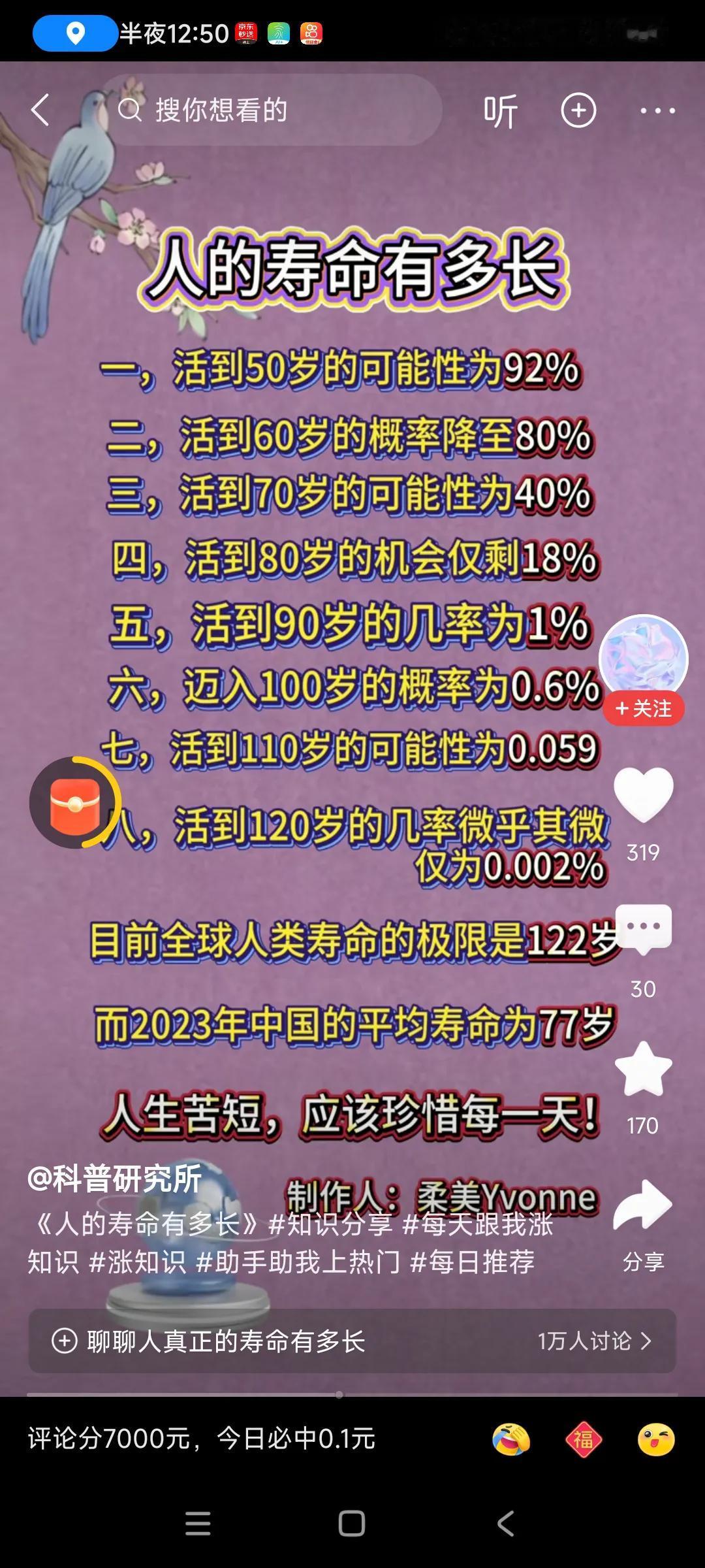 珍惜生命,60岁退休了,活到70岁的只有一半,到了70岁以后,活到80岁的,只有五分之一,,,, 所以,趁年轻,旅游,爬山,探索发现,,等到60岁以后,身体一天不如一天了,不知道哪天就走了,,,中国平均寿命77岁,我奶奶活了92岁,,,平时吃的简单,用的节约,,她最大的梦想,去下北京,上海,但是当时老人家八十了,身体不算好,不敢坐飞机,火车了,,,身体吃不消,,,