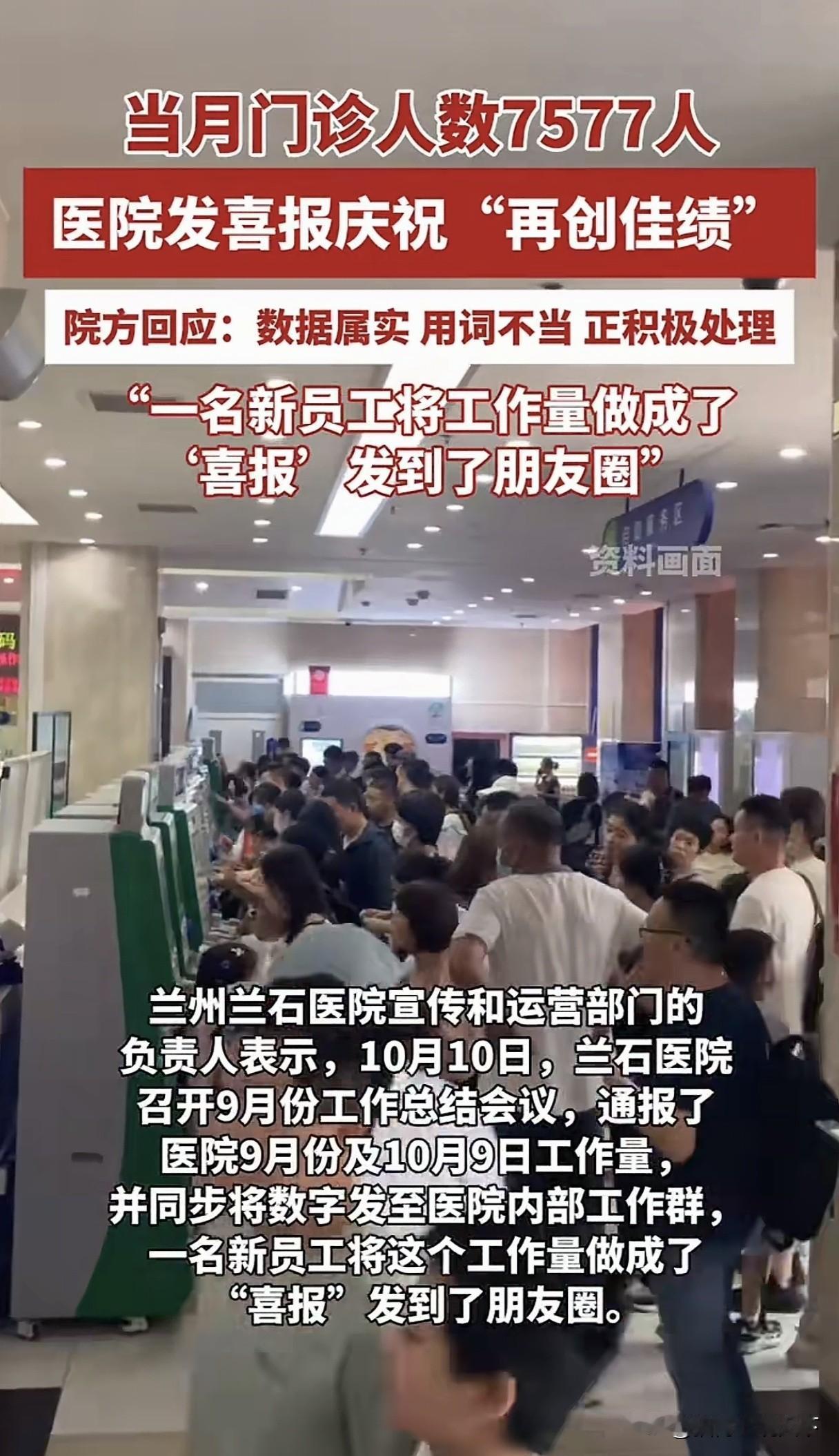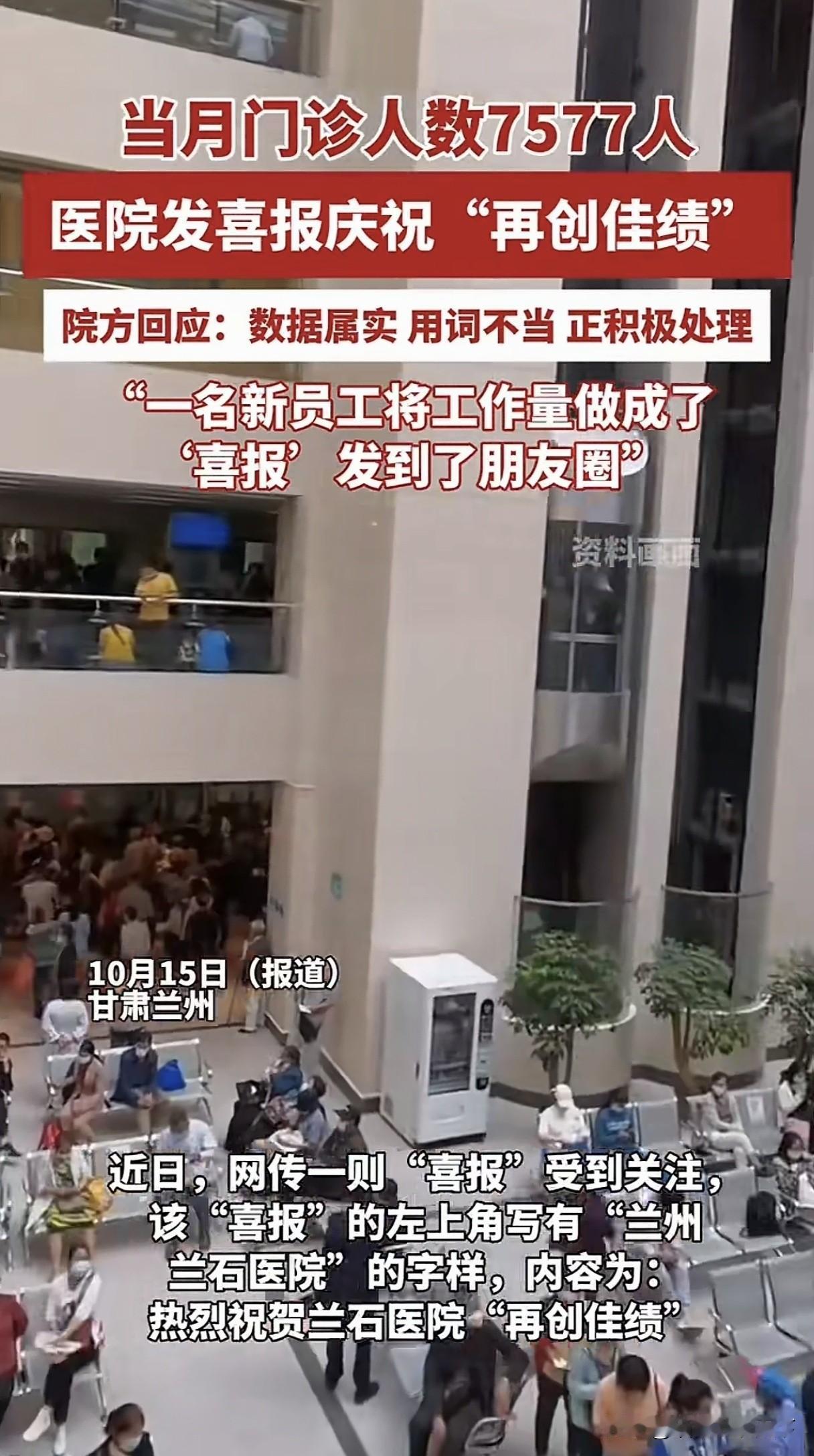 真是人才呀,兰州兰石医院,9月门诊人数达到7577人,医院竟然制作宣传海报贺喜,庆祝“再创佳绩”,引起网友强烈讨论! 医院堂而皇之的把门诊人数当做业绩,把病人顾客,把救命钱当做财富,真是看着让人无语了! 面对此事,医院简单做了回应:数据属实,用词不当,正在积极处理。这是是一名新员工将工作量做成了“喜报”,发到了朋友圈。 有网友表示:古代药店:但愿世上无疾苦,宁可架上药生尘。现在药店:会员积分买十送二,消费满58送鸡蛋。 也有网友表示:这个不是每个医院工作群的常态吗?只是泄露出来罢了。不用遮遮掩掩,老百姓心里都明白!只是无可奈何罢了。医院是营利性的。 不知道大家对此事怎么看,欢迎留言一起探讨。