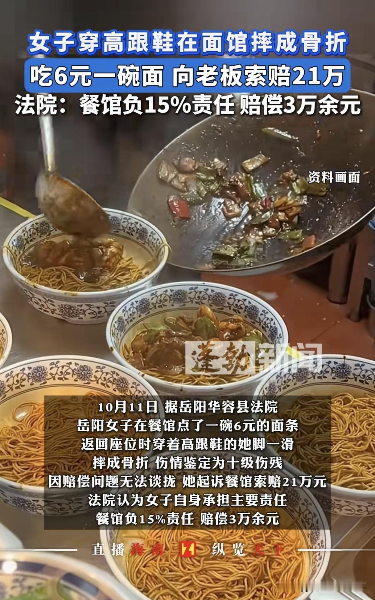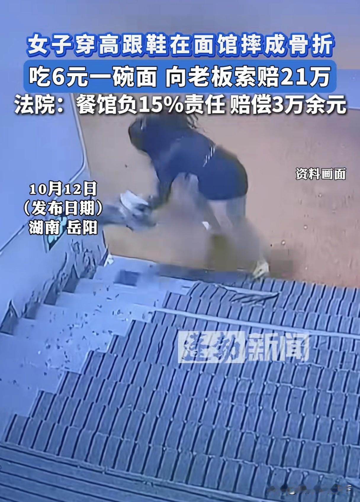 啥玩意,顾客吃了一碗6块钱的面,在店里自己摔跤了,面馆老板被法院要求赔偿3万块! 这个老板也太倒霉了吧,明明不是自己的错,顾客就花了6块钱吃碗面,还被承担3万块赔偿,老板哪里说理去? 事情是这样的,女子穿着高跟鞋👠去面馆吃面,在就餐期间因为高跟鞋👠脚滑了一下,直接给摔成骨折了,被定位十级伤残。 该女子要求面馆老板赔偿21万,法院最终判定面馆老板需要承担15%的责任,需要赔偿3万余元! 有网友表示:要论罪,女子本人第一责任人,高跟鞋厂家第二责任,给这双高跟鞋打广告的连带责任,这个楼梯的设计院第四责任。再怎么要也轮不到面馆啊。 有网友表示:很明显没有材滑,与餐馆没有关系,是鞋根大细,不稳所致,若是平底或粗根鞋,后果会不一样,让餐馆负一定责任,实在难以让人接受。 有网友表示:女子穿高跟鞋在法院门口摔倒,摔成骨折,起诉法院索赔21万。请问法官该怎么判? 不知道大家对此事怎么看?欢迎留言一起探讨交流。