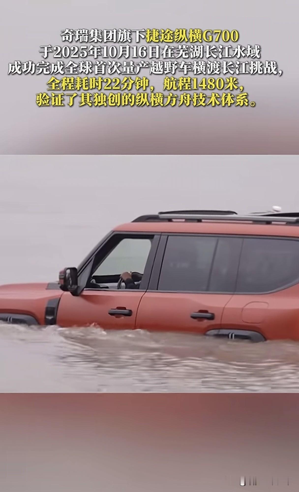 厉害了奇瑞,奇瑞旗下越野车首次横渡长江,航程1480米,用时22分钟,实现了汽车行业的突破,这回大家明白了,买车为什么要交“车船税”了吧! 开车下水,有人表示震撼,也有人表示纯属多余,没必要。 有网友表示,交了这么多年车船税,第一次有了真正的价值,车船税真不是白交的。 也有网友表示,为啥要开车渡河呢,不是好的引导。证明好车,有很多方法吧,比如参加拉力赛。国内车企要做好底盘调校,刹车制动等车用的东西,不要搞一些无用的,汽车就是汽车! 还有网友表示,造车就好好造做好耐久,做好安全,想下河我们开船不好吗? 还有网友表示,这样实验一次,人家回去就可以报废,你自己的车可没人换,电池密封再严也会有轻微泄露 不知道大家对此事怎么看?欢迎留言一起探讨交流,汽车能下水真的没有必要嘛? 奇瑞品牌 奇瑞车 捷途
