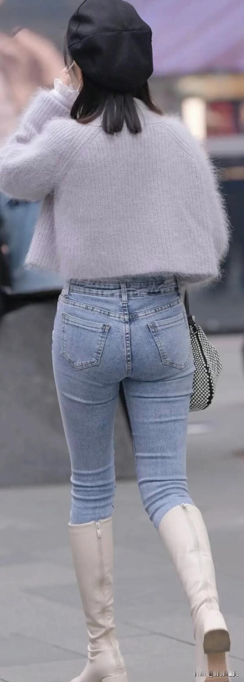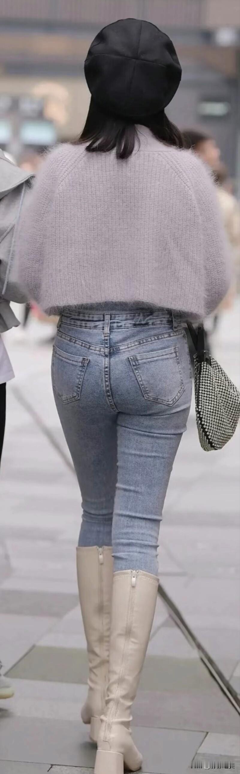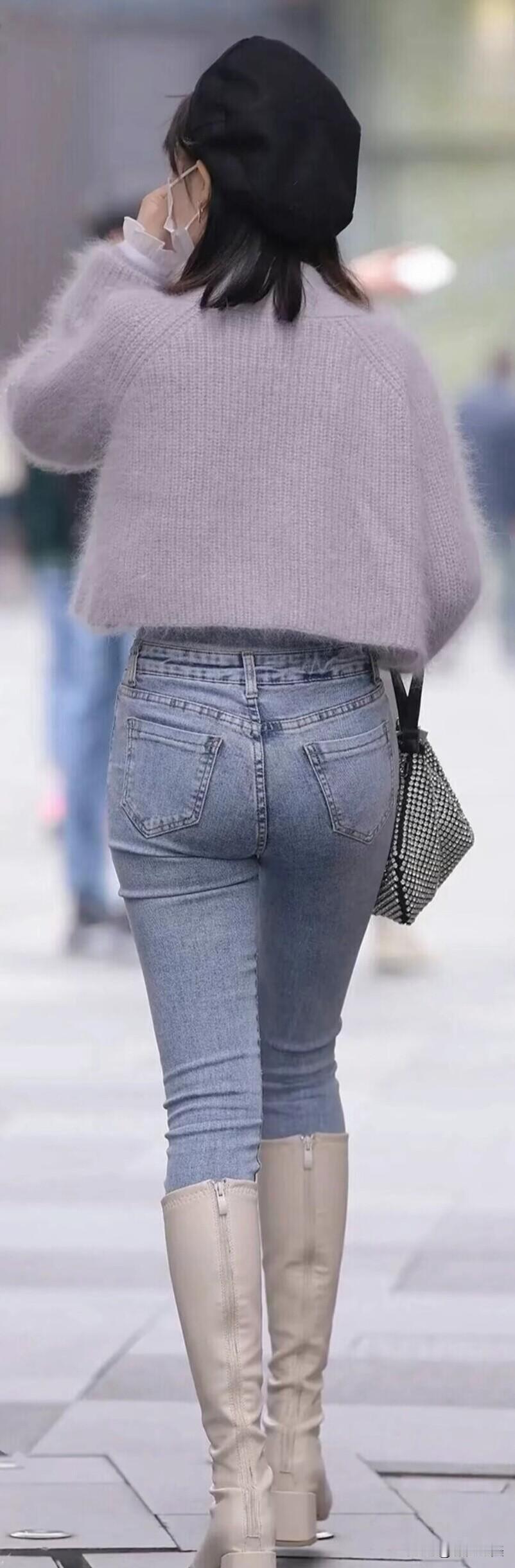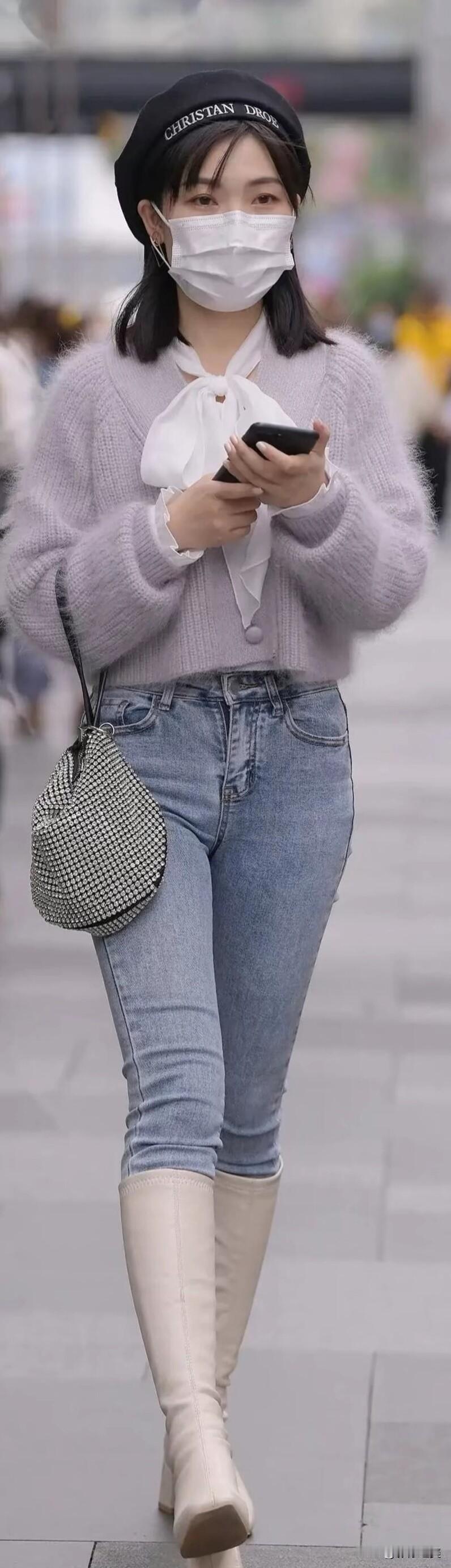 香芋紫毛衣配浅蓝牛仔,搭米色长靴与贝雷帽,甜酷又温柔,早春氛围感绝了~