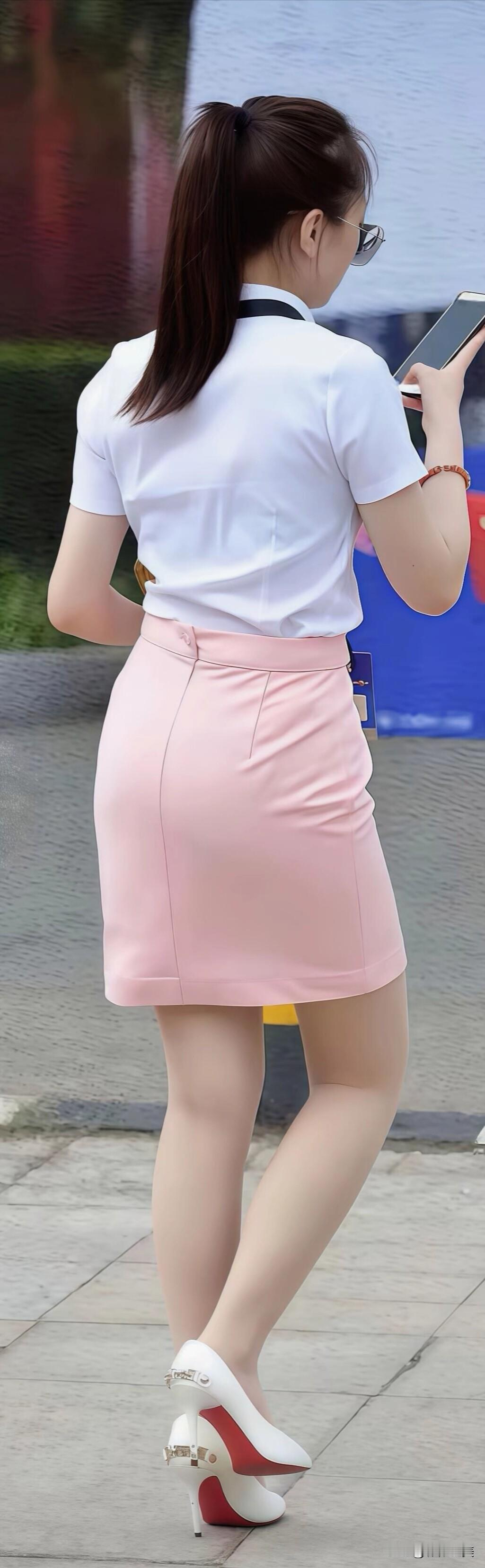 白衬衫配粉色短裙,再踩双白色高跟鞋,这位职场姐姐的穿搭简约又精神。