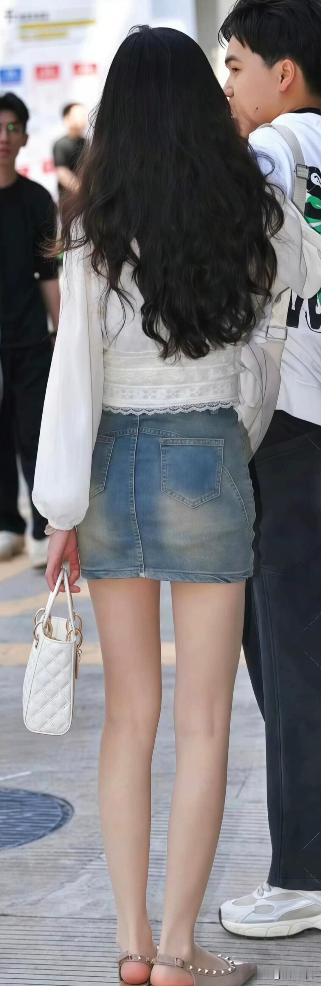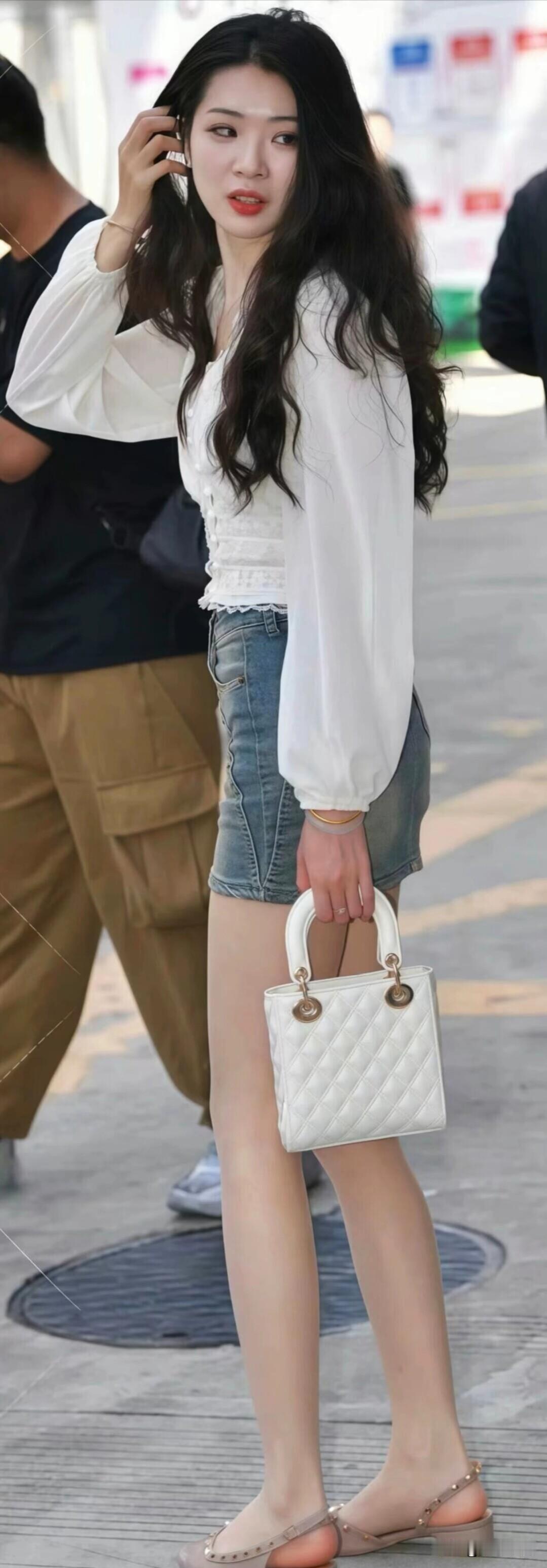 白色蕾丝上衣搭牛仔裙,配精致白包和裸色凉鞋,长发飘飘,夏日甜美感直接拉满~