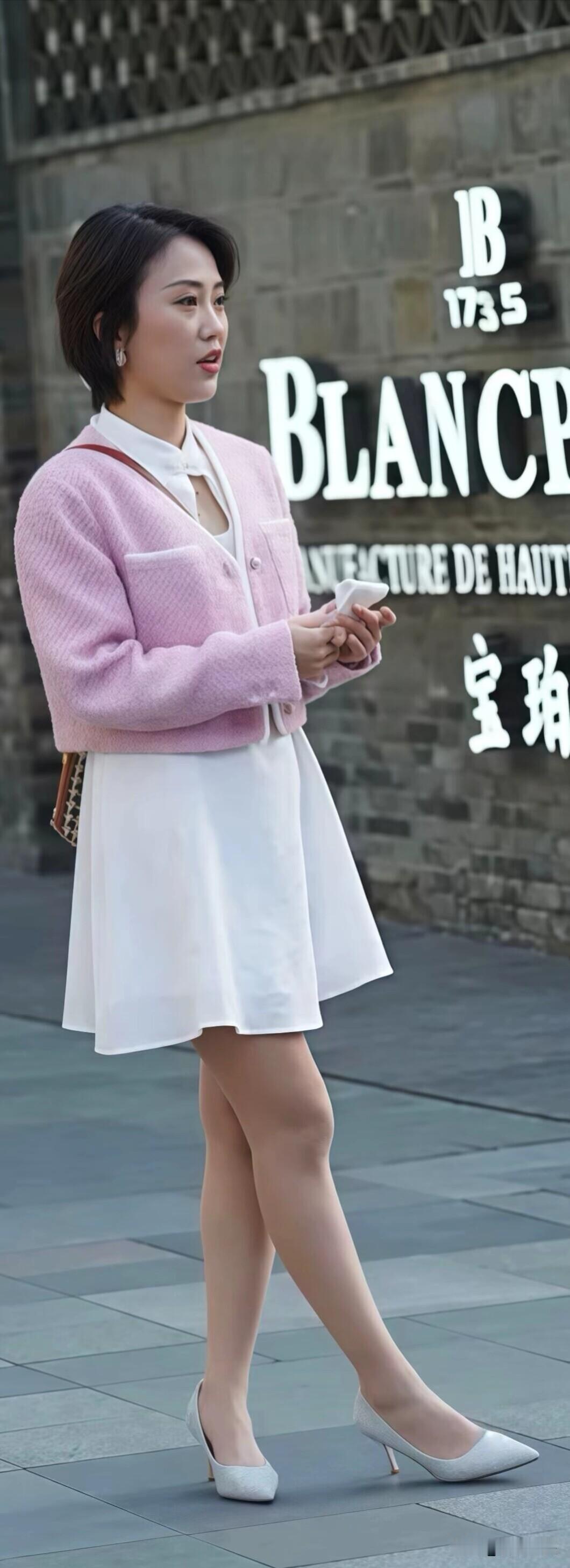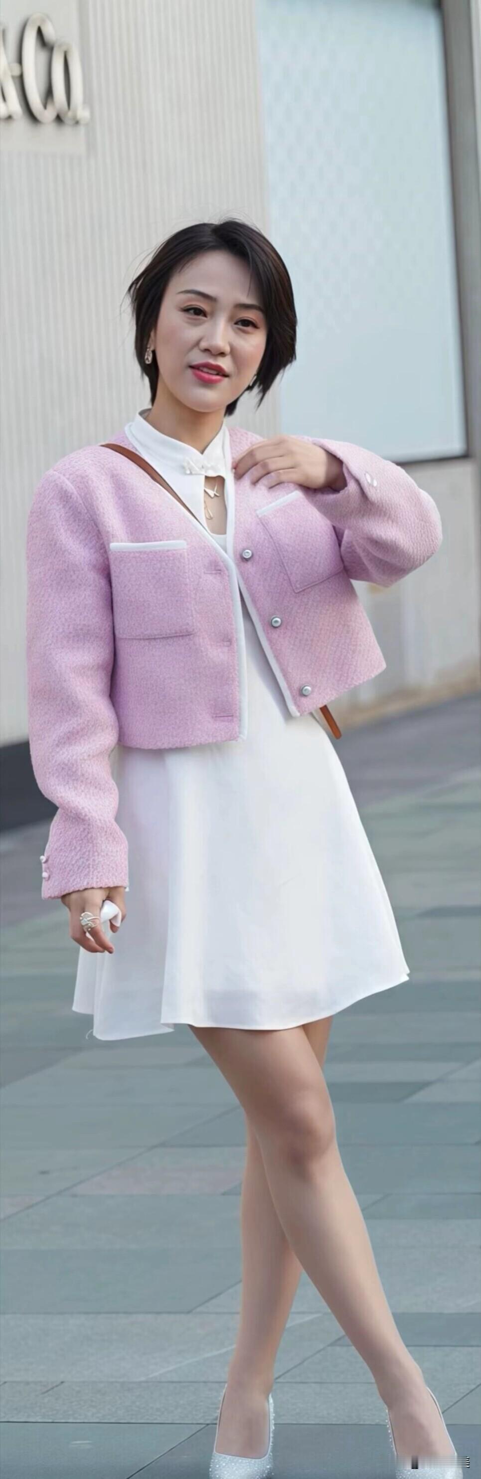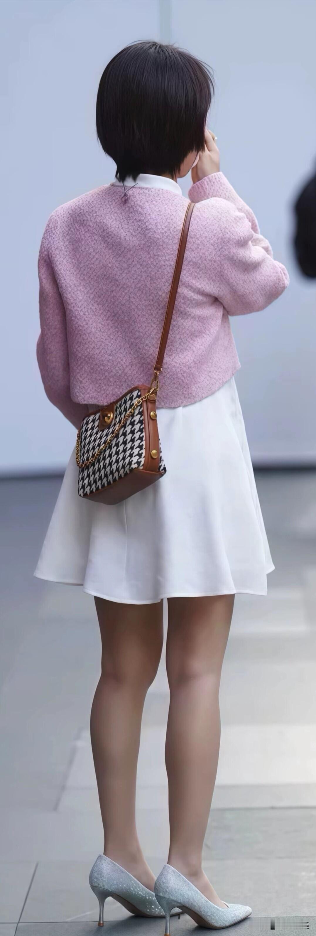 粉色外套搭白色连衣裙,配银色亮片高跟鞋和格纹小包,甜美又精致,这穿搭很有春日氛围感~
