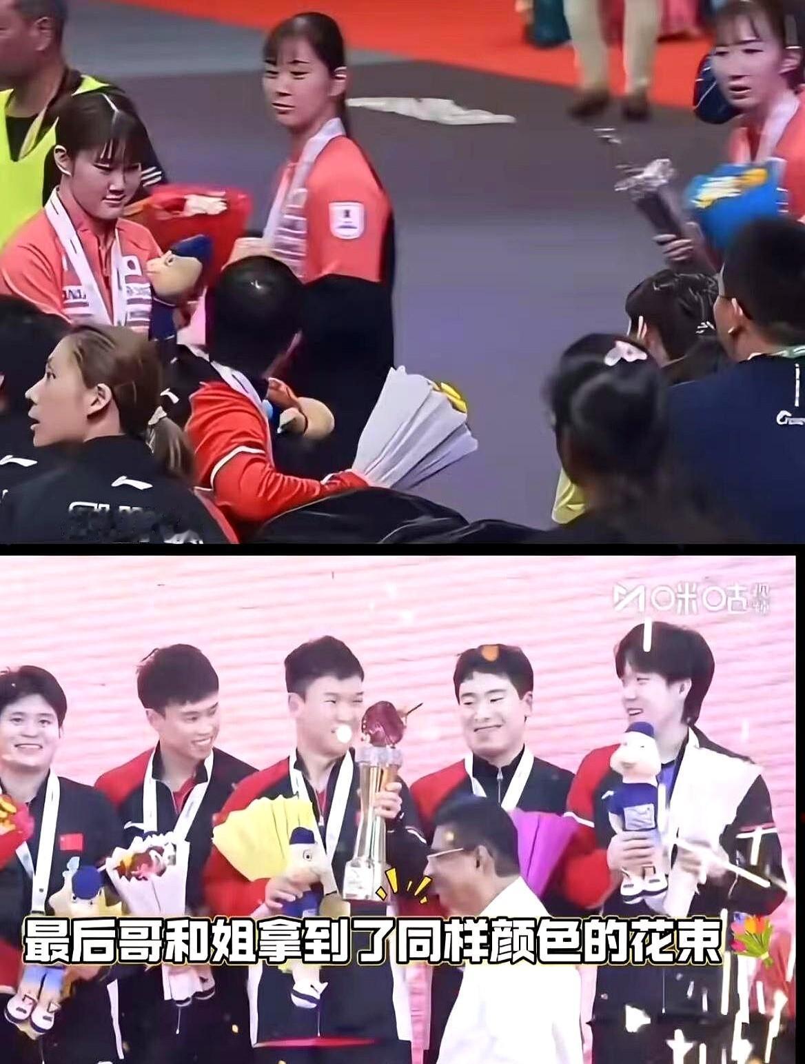 莎莎和楚钦真的太微妙了太玄乎了! 这颁奖典礼上的缘分,简直是天意安排好的! 日本队的大腾沙月走过来,主动把自己的白色花束递给莎莎,莎莎接过来顺手就回赠了自己手里的花束,这一下让大腾沙月当场就受宠若惊,脸都红了。 真正妙不可言的是,随后上场的王楚钦也拿到了白色花束,这可不是谁都能安排的巧合,两个人就这么拿着同色花束站在一起了。 我们中国运动员之间这种默契,才是真正的天作之合,别人怎么学也学不来。