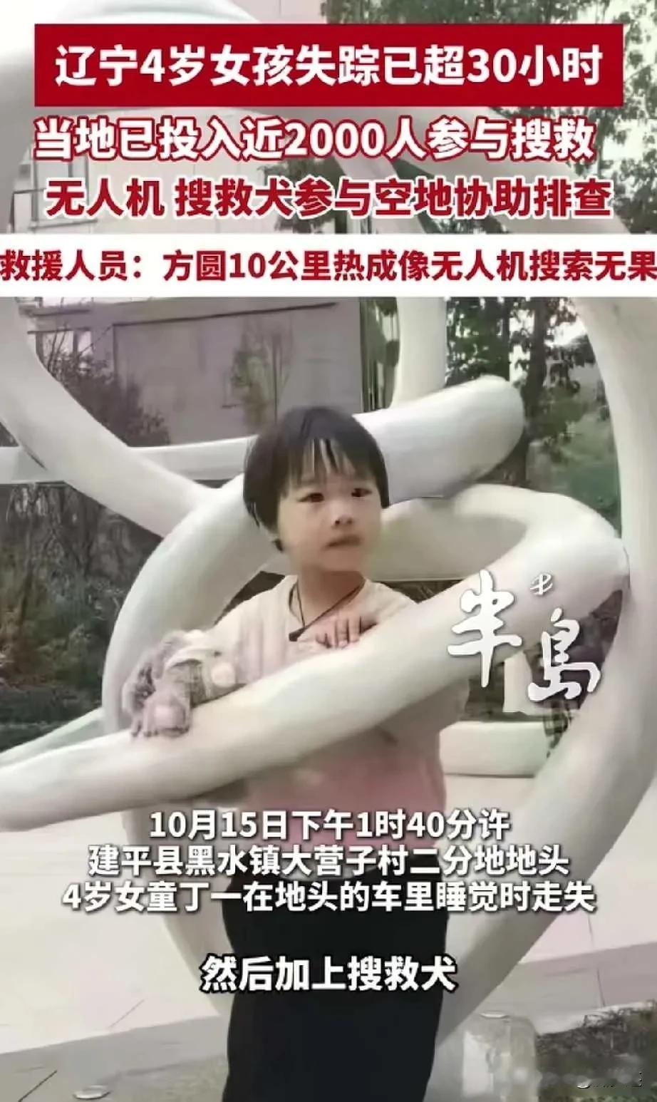 四岁女童山野失踪,全民搜救轰动全网,她到底怎么回来的? 2025年10月15号晚上,辽宁黑水镇有个四岁的小女孩,叫丁一,她在一辆面包车里睡着了,醒来人就不见了,家里人急得团团转,满村子找,满山沟找,直到17号上午,有人在离车不到两公里的山沟里发现了她,孩子没大碍,就是胳膊上有点擦伤,可谁也说不清她是怎么一个人走丢的,也没人知道她那三十多个小时,一个人是怎么熬过来的。 网上吵得厉害,有人说孩子是被人拐走又送回来的,也有人说家长在故意炒热度,还有人问,孩子怎么能在车里睡那么久都没人发现,监控去哪儿了,有没有人帮忙,警方为什么不公布车里的录像和行车路线,大伙儿心里还是不踏实,这次找人倒是快,无人机飞,警犬嗅,村民上山,一寸一寸地搜,效率是高,可这背后是不是说明平时压根没人管? 黑水镇太偏,路上摄像头没几个,电动车和面包车也没装定位,孩子睡着了被锁在车里,谁都不晓得,农村好多孩子都是老人带,爸妈在外头打工,丁一是不是这样,报道没说,但八成是,前两年湖南有个三岁男孩闷死在货车里,江西也有个四岁女孩被扔在高速上,这些事都一样,孩子太小,不会喊,大人没看住。 农村人觉得孩子皮实,出去玩没啥大不了,城里人却恨不得眼睛一刻不离,法律说八岁以下不能没人看着,可村里没人真去查,有些地方发了儿童手环,能设电子围栏,但东北乡下几乎没人用,好东西咋就到不了小地方,孩子回来了是好事,可下次呢,别等出了事才满世界找。女童失踪 辽宁 辽宁