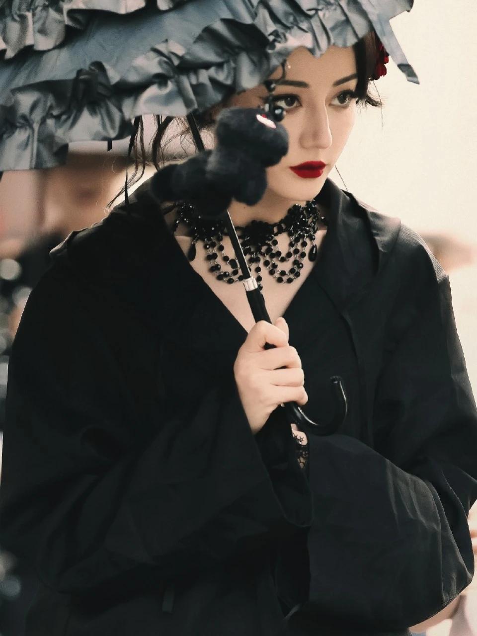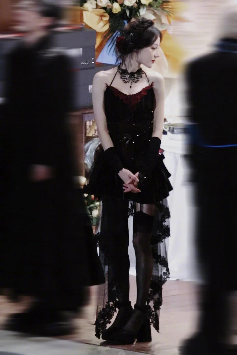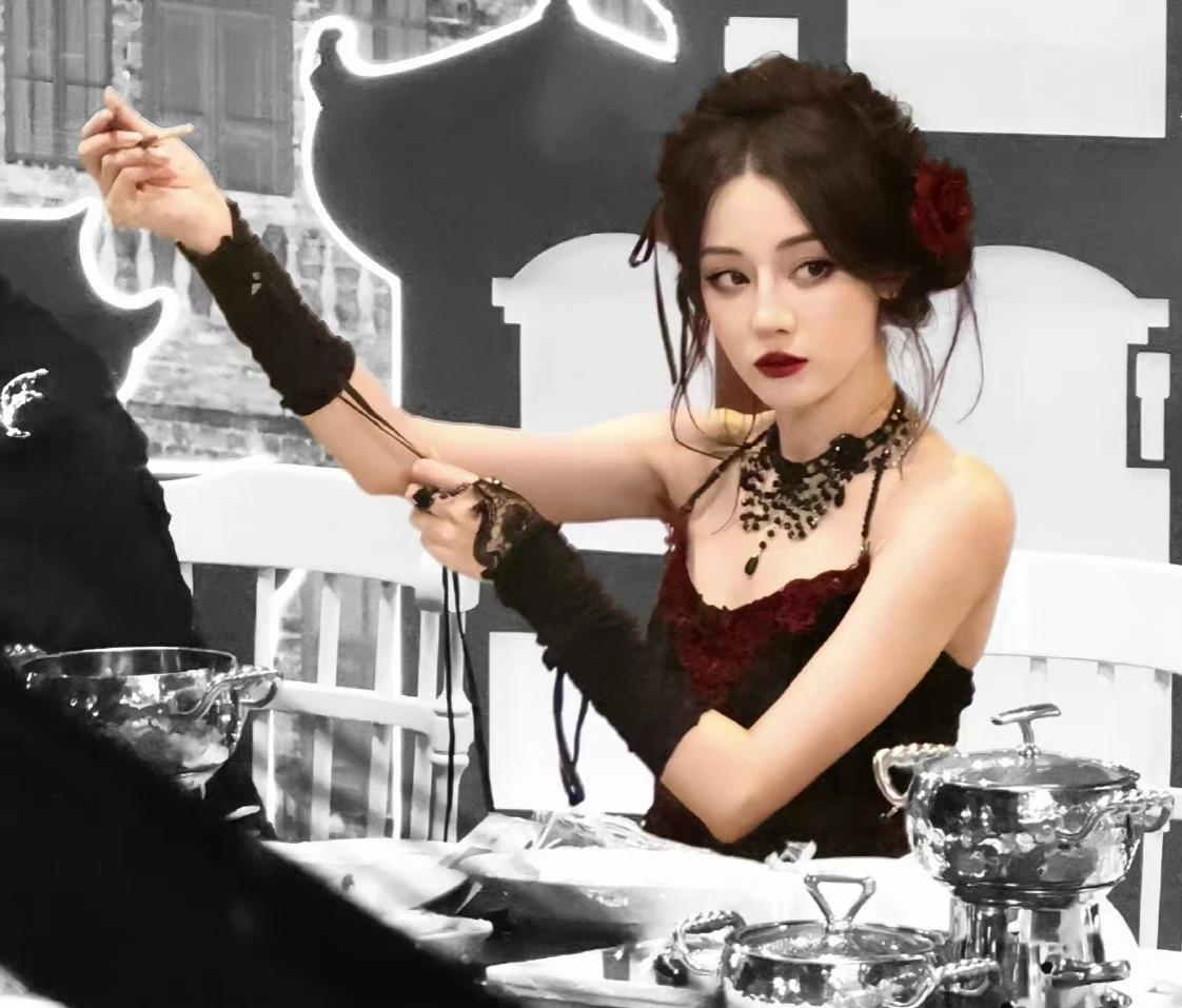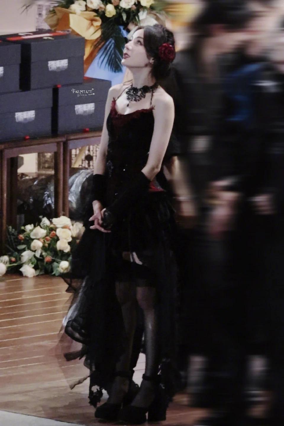 迪丽热巴这个造型真的很绝啊!黑色加暗红色,还头戴一朵玫瑰🌹,简直暗夜女王那味有