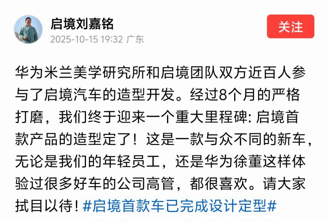 8个月时间打磨一个造型,广汽和华为够用心了。 启境汽车CEO刘嘉铭发文表示,由广汽集团与华为联合打造的高端智能新能源汽车品牌启境首款汽车造型已确定,它由广汽团队联合华为米兰美学研究所近百人历经8个月打磨,这款与众不同的新车备受包括华为高管在内的人员青睐。 从刘嘉铭“剧透”的启境图片来看,被幕布覆盖的汽车轮廓和整体呈现的质感,在设计上充满神秘与高端感,首款车型造型极具辨识度,尚未完全揭晓便已透露出与众不同的高端气质,不愧是融合前沿美学设计与智能科技的高端新能源汽车品牌,其首款车型的最终亮相值得期待。 从幕布勾勒出来的流线型车身来看,这款车大概率有着轿跑式的动感姿态,车顶线条从车头向车尾流畅下滑,车身轮廓呈现出强烈的运动感,结合启境与华为米兰美学研究所的合作背景,这种造型设计既体现了高端轿跑的动感基因,又蕴含着前沿的美学理念,与普通车型形成鲜明差异,难怪内部人员都评价其“不一样”。 就喜欢这种直接甩进度、讲干货的发布。造型定了,接下来大家很想知道的就是广汽在智能座舱和智驾方面,会和华为怎么合作了。 8个月时间打磨一个造型,在现在追求快节奏的行业里不多少见,我觉得广汽这次是真的想做好产品。毕竟行业内新车造型开发通常只有4 - 6个月,而启境花费8个月,这种慢工出细活的态度,更能体现其对产品美学的极致追求。 我还特地查了华为米兰美学研究所的背景,发现他们参与过很多高端消费品和旗舰手机的设计。比如,华为米兰美学研究所曾操刀华为Mate系列旗舰手机的外观设计,还参与过某奢侈品牌智能穿戴设备的美学研发,这样的团队加持,让启境的造型设计从诞生起就自带高端审美基因。 期待启境的最终亮相。华为 广汽
