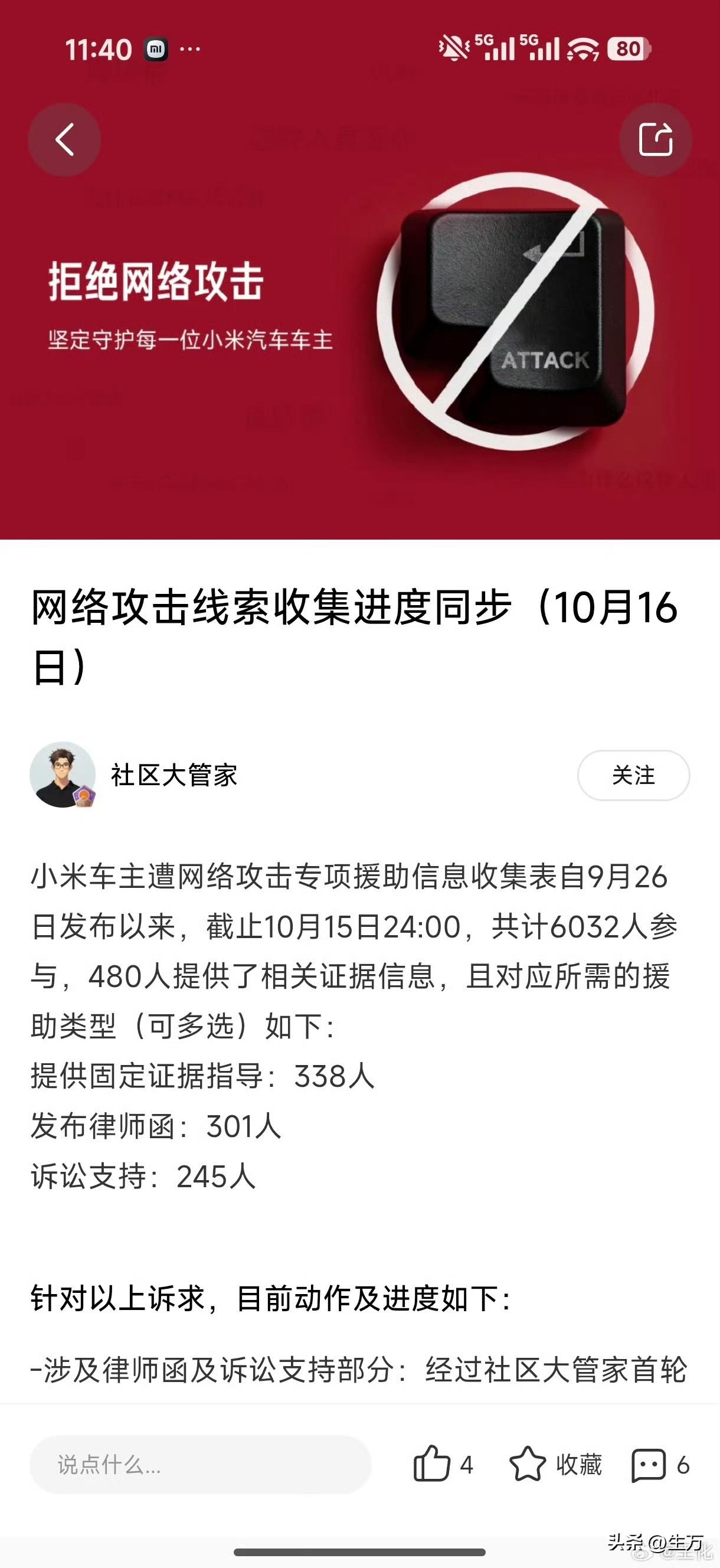 小米王化: 法务部又出手了! 就在刚才,小米文化在社交网络上汇报了他们最新的工作情况进展! 这次是他们的小米车主受到网络攻击的情况汇报,从上个月的26号到昨天,他们一共找到了6000多人参与这件事情! 固定证据300多人,律师函都发了三百多份,诉讼200多人! 可以说是工作效率拉满了,看这个样子,他们对自己的工作是很满意的,毕竟这种事情他们有理有据。 接下来就要看他们怎么处理这些人,而且他们发布也有的忙的,毕竟三百多个官司在等着打,这是一个很庞大的工作量。