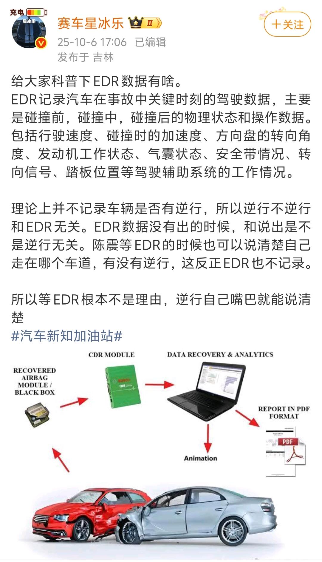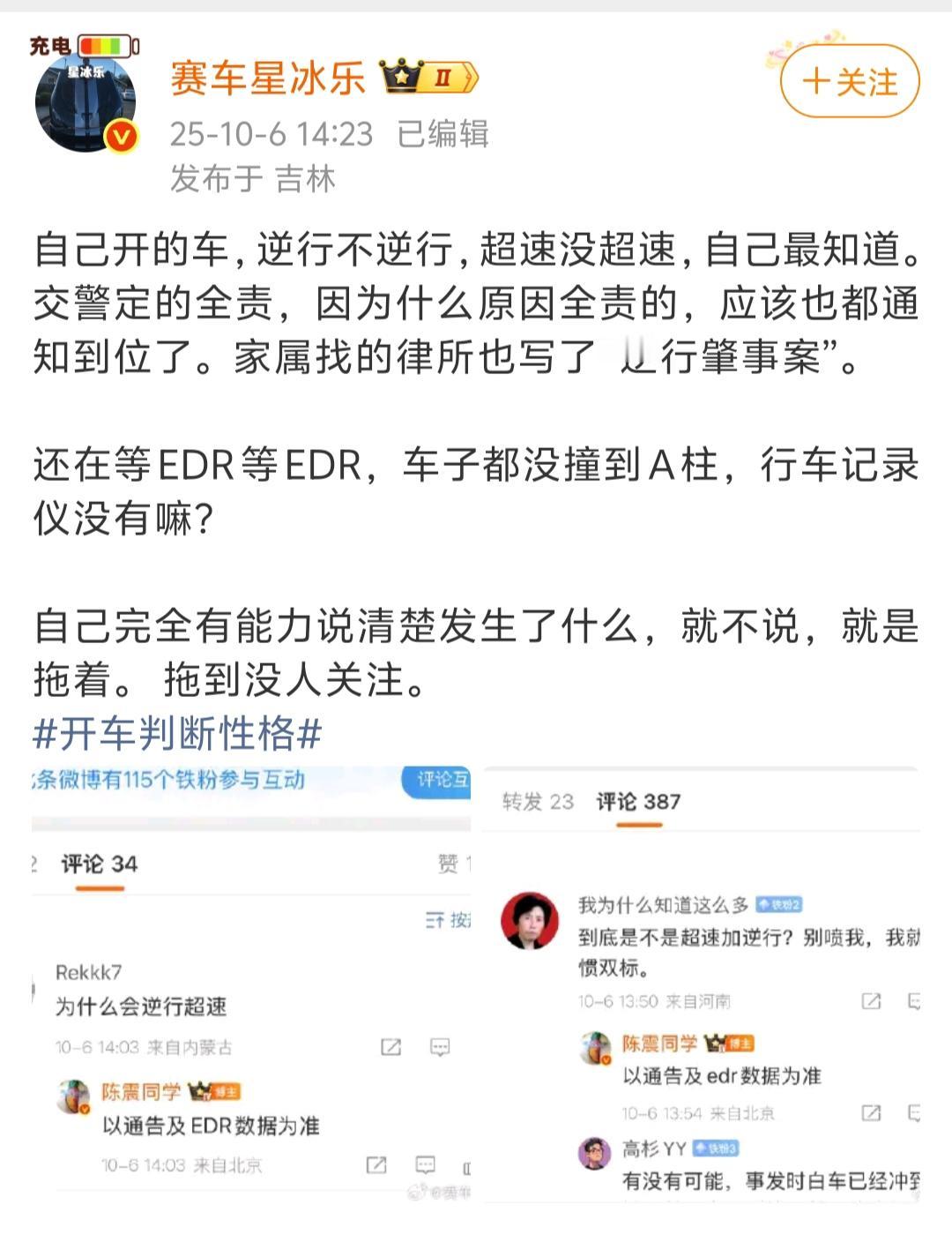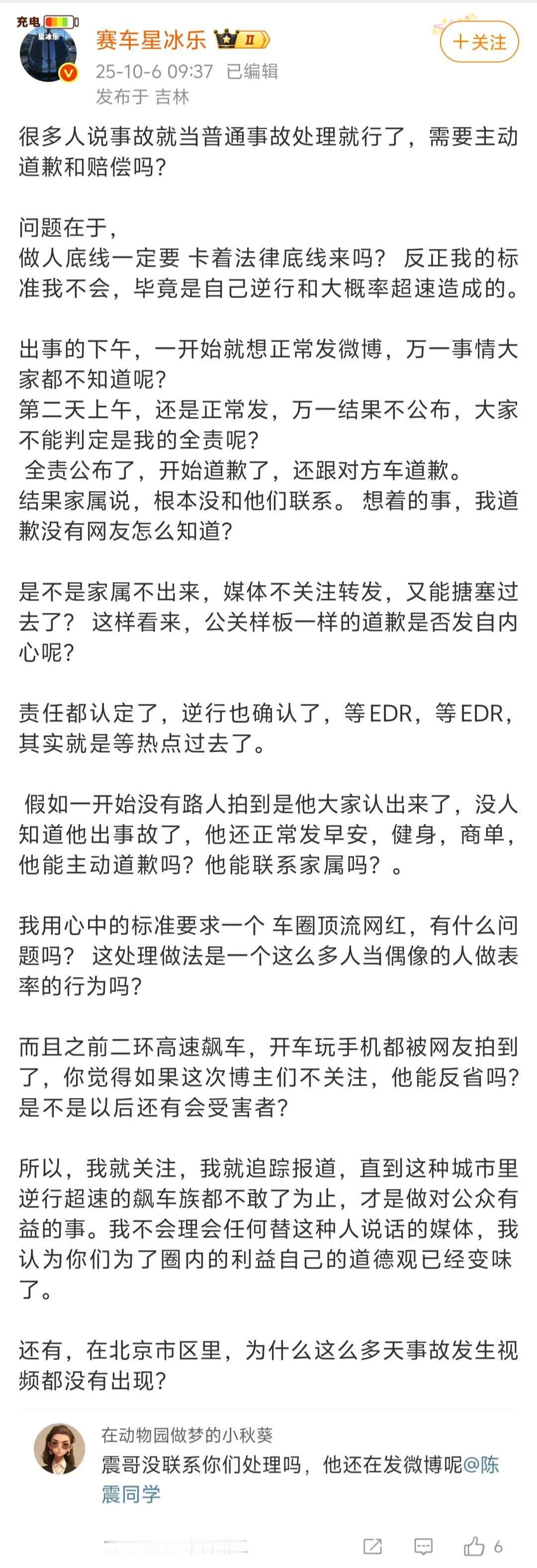 陈震气得把冰冰哥一个多月前的聊天记录都翻出来了,质疑他现在跳出来的目的。 陈震出车祸后,冰冰哥先是内涵陈震在全责且造成对方受伤的情况下,仍照常发布商业推广、生活日常,表现得像没事人一样,而自己若处于这种情况会因愧疚难以如此操作。他还多次转发陈震车祸相关文章并发表个人意见,称事故诡异,不理解顺行车辆为何被撞那么远,同时提醒大家不要超速、不要逆行。 不过,冰冰哥相关言论引发网友热议,有人认为他借此炒作,也有人觉得他的言论反映了公众对陈震作为公众人物和专业车评人在事故后态度的不满。 博主“T0othache ”在看到陈震曝光了和冰冰哥的聊天记录后,质疑陈震在某汽车车祸和自己驾驶劳斯莱斯逆行致他人受伤事件上的双重标准,认为他对国产品牌有偏见。 我翻了翻冰冰哥近期的微博动态,发的最多的内容都是与陈震车祸相关。比如,有质疑陈震的事故处理态度的,有批评陈震的道德与责任担当的,有科普EDR数据来反驳陈震的借口的,甚至还有对事故相关账号关闭的猜测来内涵的。他做的更多的是转发并认同其他大V对陈震的批评,认为陈震名声变差是自身原因导致,且说他人“落井下石”是道德绑架。