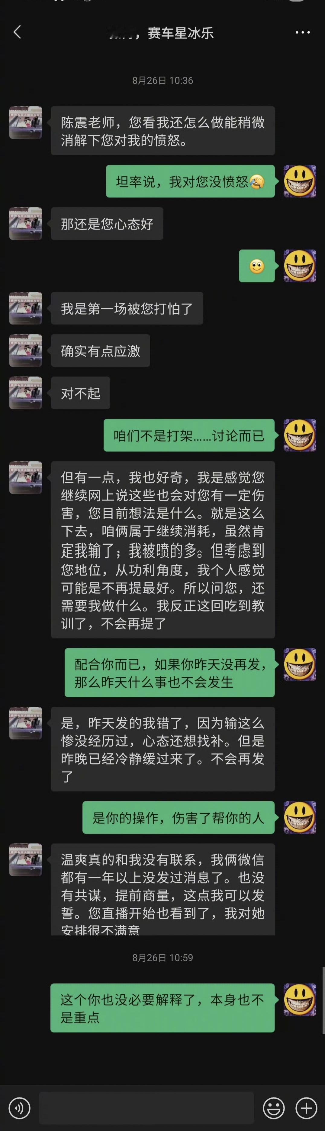 陈震气得把冰冰哥一个多月前的聊天记录都翻出来了,质疑他现在跳出来的目的。 陈震出