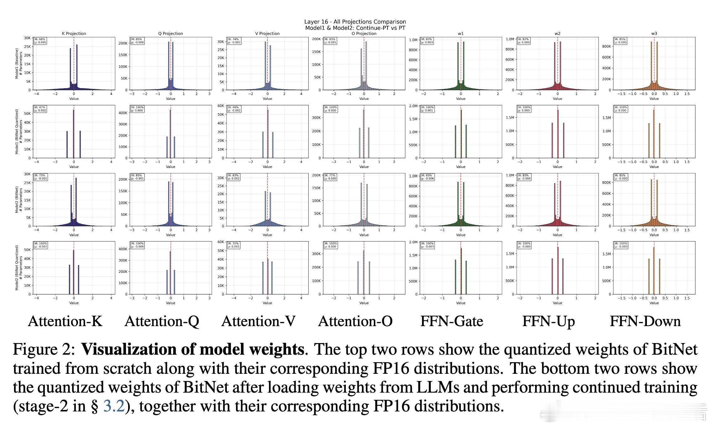 - 持续预训练帮助量化权重分布从高斯形态逐渐向BitNet特有分布靠拢,避免陷入局部最优。