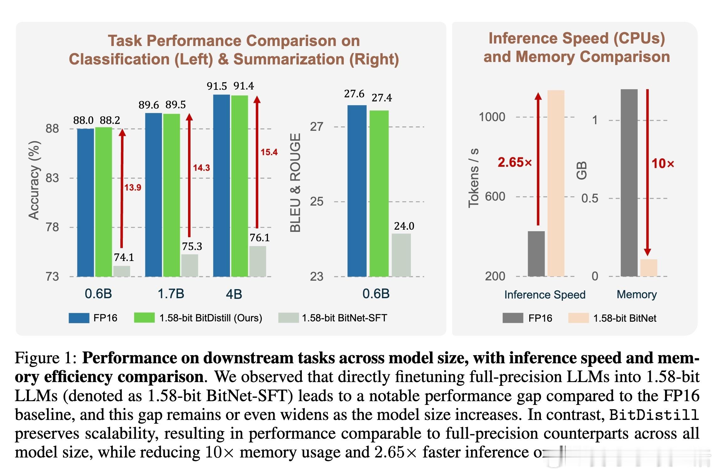 在GLUE文本分类(MNLI、QNLI、SST-2)和CNN/DailyMail文本摘要任务中,BitDistill 1.58位模型性能与FP16微调模型相当,且推理速度提升2倍,内存占用降低10倍以上,支持0.6B到4B参数规模多种模型,且对不同预训练基线(Qwen2.5、Gemma)均具鲁棒性。