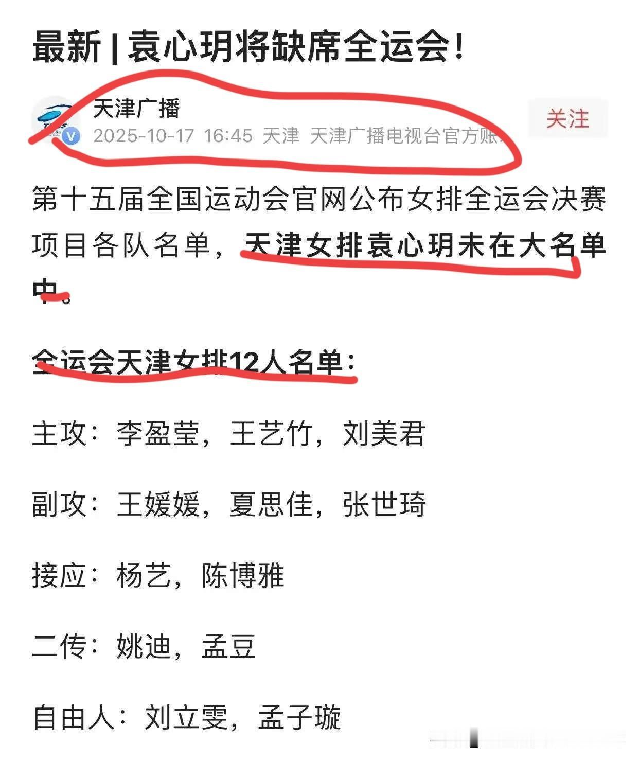 [玫瑰][玫瑰]第十五届全运会赛前,域粉信誓旦旦的说:全运会成人女排冠军非津莫属,提前预定,是板上钉钉。 然而,随着袁心玥由于种种原因无缘代表天津女排参加全运会的事实,这种自信和借来的底气顿时顿减,似乎又回到了:没有外面的人进来,夺冠会变得非常困难和陷入七上八下的状态与十分尴尬的境地。由此可见,袁心玥对天津女排实现夺冠目标的重要性。 可不管怎么说,事实只有一个,就天津女排而言:目标只是一个,夺冠是必须的,得亚就是输,就是失败。必须强打出十二分的精神,大声喊:不夺冠不天津! 那么问题来了: 有袁心玥的天津女排,在全运会上夺冠未必一定就是板上钉钉的。 那么,没有袁心玥的天津女排,在全运会上能获得第几名? 冠军? 亚军? 季军? 铁军? 第五名? 第六名? 竞技体育,位次没有预定,没有板上钉钉,一切皆有可能! 全运会女排