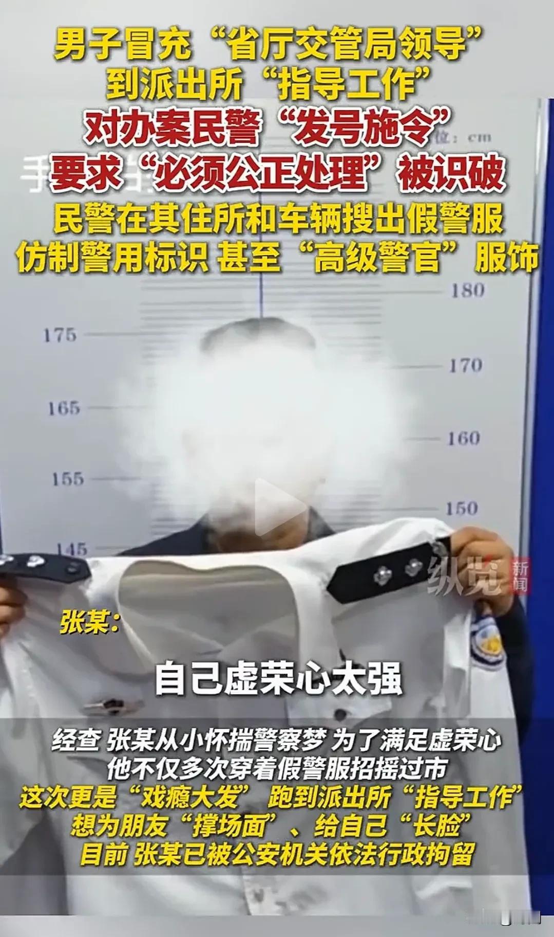 白衬衣亲自到派出所指导工作,男子为给朋友撑腰,穿假警服到派出所指挥民警处理案件。事发10月12日左右,辽宁省辽阳市处理了一件冒充公安厅领导的招摇撞骗案。 据消息,工农街派出所民警正在处理一起两人普通的民事纠纷,突然,外面走进来一位“白衬衣”领导,多名民警感觉事情不妙“领导来检查了?”。 只见这名男子径直走向正在协调纠纷的办公室,并对办案民警进行“训斥”和“指挥”,要求其“秉公处理”这案子。后来,多位民警经过和其交流观察,察觉到异常,随后控制了这名男子。 据查,该男子张某,为了满足虚荣心,多次穿厅级公安领导假警服在街道和各其他场所“耍威风”,这次为了给被抓的朋友长面子,有了经验的自己就觉得在派出所里没人能发现,结果一下就露馅了。 警方随后对其住址和汽车搜查,发现了大量警用装备和服饰,全部被强制没收,张某也被行政拘留,正在进一步调查是否存在犯罪事实。