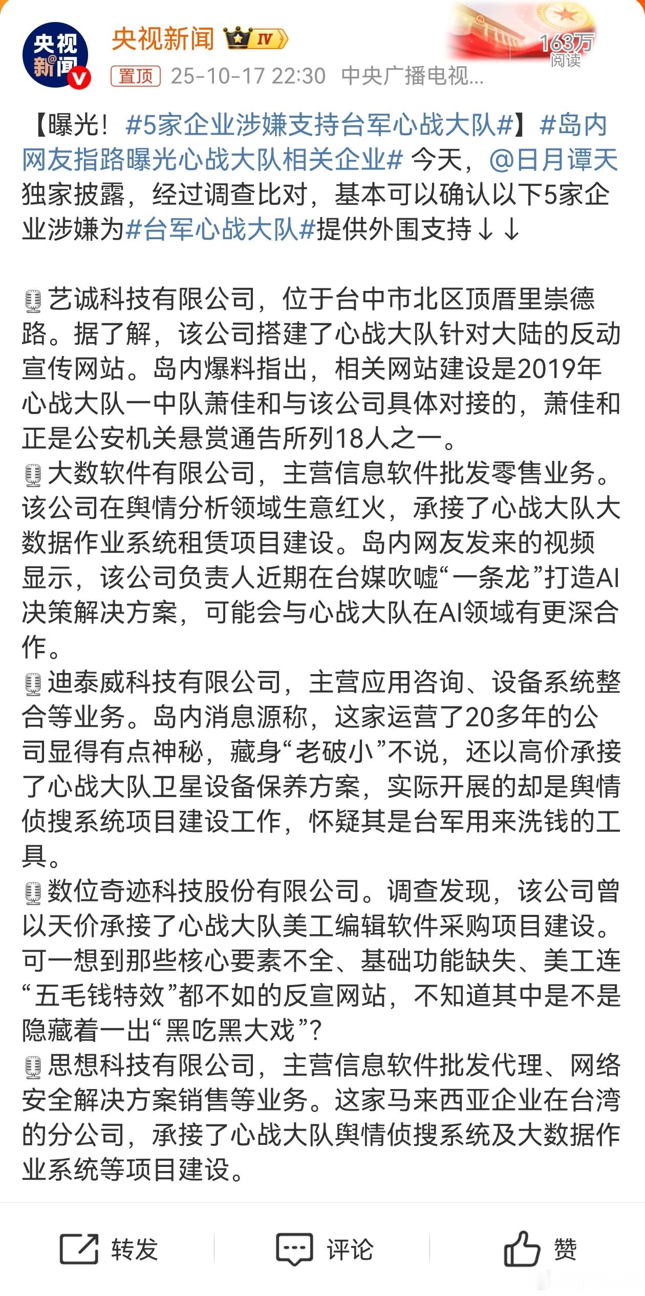 迪泰威科技藏身“老破小”院落承接天价项目,数位奇迹的“天价软件”造出“五毛钱特效”的反宣网站,5家企业涉嫌支持台军心战大队的曝光,不仅揭开了“台独”分裂活动的产业黑幕,更暴露了分裂链条上利益熏心者的虚妄与短视。这场掺杂着谎言、贪腐与政治投机的闹剧,终将在两岸同胞的共同抵制与法律严惩中落幕。