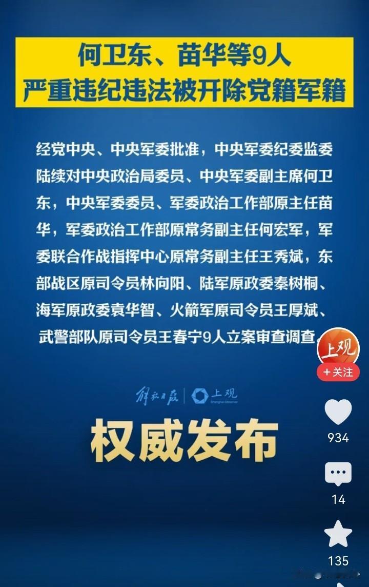 今天的重磅发布,包括中央军委副主席何卫东、中央军委政治工作部原主任苗华在内的9个高级将领,因为严重违纪违法,被开除党籍军籍!这正说明了军队不惜刮骨疗毒、锻造干净担当的强大军队的信心! 经查,这9人“涉嫌严重职务犯罪,数额特别巨大,性质极为严重,影响极其恶劣”。 对他们的调查,进一步说明了,国家坚持无禁区、全覆盖、零容忍,重拳惩贪肃腐,军队反腐败斗争不断向纵深推进。 这些落马者,曾经,他们在军队中也是从一个刚入伍的新兵蛋子做起,在练兵场上挥洒汗水,不怕流血流汗,从士兵、排长、连长等基层岗位做起,在他们的心中,应该有着为军队的强大做出自己的贡献的初心。 可是,到他们身居高位,在金钱利禄面前,却没有守住应有的底线。一句“涉嫌严重职务犯罪,数额特别巨大”,读来惊心! 只是,不忘初心,方得始终! 保家卫国的人民军队,岂能让这些腐败分子藏身,甚或让他们败坏部队的风气,不想着“艰苦奋斗”,而去想着靠溜须拍马、金钱开路跑官买官? 还是那句老话:莫伸手,伸手必被捉! 对那些不忠诚于党、国家和人民的,不管他处于怎样的高位,都要坚决查处! 保家卫国的人民军队,则更加要风清气正,要锻造忠诚干净担当、堪当强军重任的高素质干部队伍! 这些年来,人民军队的武器装备有了长足的进步,第五代战机的歼-20A,歼-35A,海军有了“辽宁”、“山东”、“福建”3艘航母,火箭军方面“东风-5C”可以全球打击,全时戒备,保护着国家人民…… 有了这些先进的武器装备,加上更加纯洁巩固、更具强大凝聚力战斗力,忠诚于党、国家和人民的士兵与将领,我们必将能在以后的军事斗争中取得胜利!