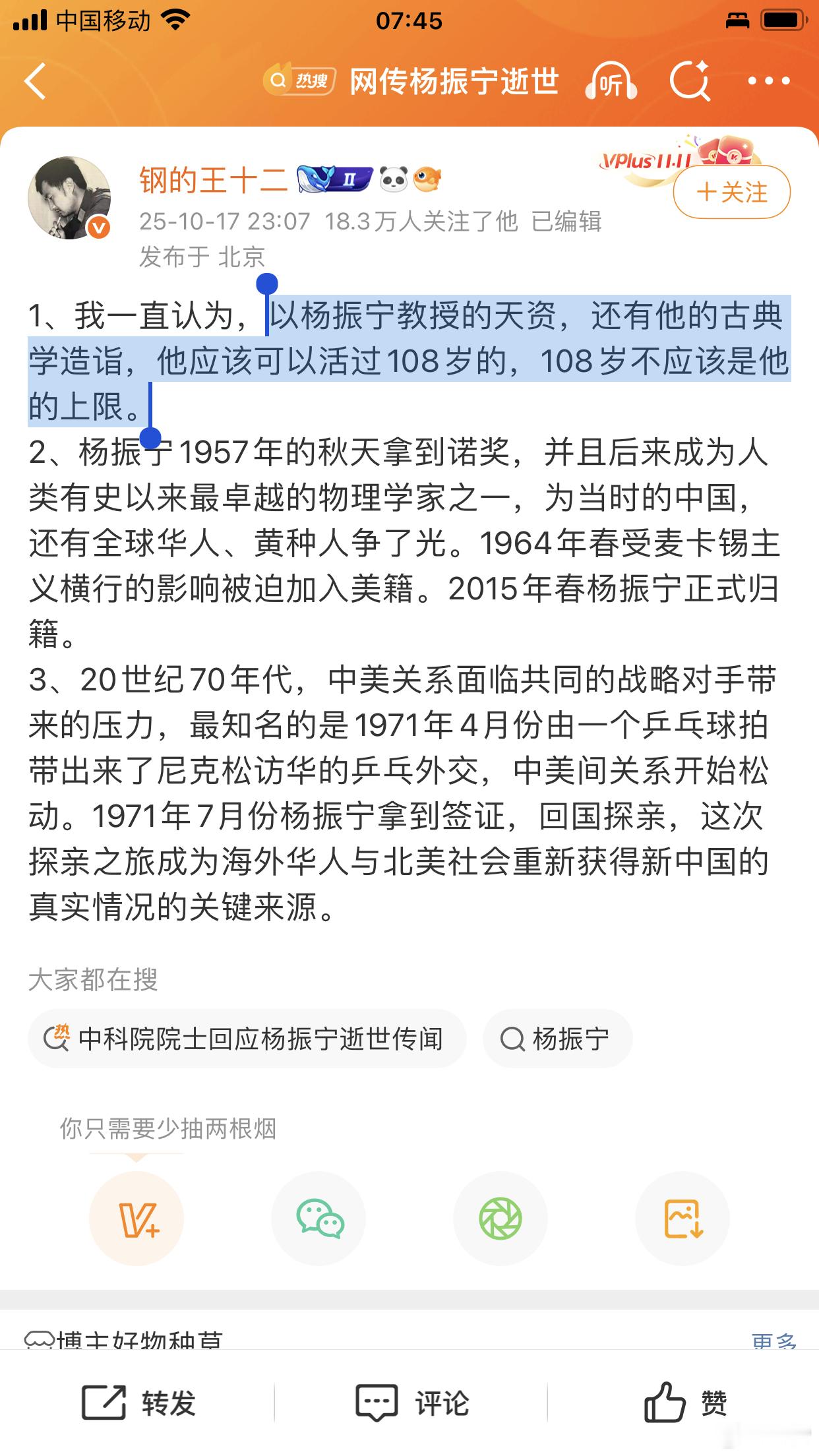 杨振宁院士半月前刚过103岁生日以杨振宁教授的天资,还有他的古典学造诣,他应该可以活过108岁的,108岁不应该是他的上限———不要妄测天机。