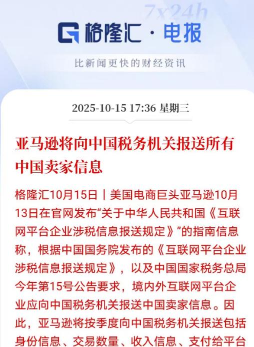 亚马逊突然向全球中国卖家发出通知,要求10月31日前向中国税务机关报送三季度完整交易数据。不管你是在美国站卖T恤,还是在欧洲站做家居,身份证号、卖了多少单、赚了多少钱、给亚马逊交了多少佣金,都得老老实实列清楚,想藏着掖着根本没门儿! 这可不是亚马逊闲着没事干给卖家找不痛快,更不是平台自己定的规矩,背后全是按章办事。毕竟亚马逊在国内是注册过的外资企业,只要在这片地界上做生意,就得跟着当地的法律走,没谁能搞特殊。 要报的数据细得很,不光是基本的身份信息,连每笔交易的流水、利润分成、给平台交的各项费用都得一一列明。 不管你做的是哪个国家的站点,卖的是廉价小商品还是高端家居用品,只要身份是中国卖家,就躲不开这道手续。 以前可能有人觉得跨境生意隔着国界,数据查起来麻烦,能含糊就含糊,现在看来这种心思可以彻底打消了。 这背后早有法律定调,2023 年开始实施的《税收征管法》修订案里就写得很清楚,跨境平台经营者必须配合税务机关提供交易数据。 亚马逊作为行业里的头部平台,自然得带头执行,不可能顶着法律风险给卖家 “开绿灯”。 要是不配合,别说在中国市场没法立足,后续的业务开展都会受影响,这种亏本买卖平台可不会做。 而且这事儿也不只是国内的要求,之前中国早就跟 137 个国家签了《税收征管互助公约》,跨境税收这事儿本来就是全球一起盯着的。 以前有些卖家想借着跨境的空子少交点税,现在有了国际间的协作,数据打通了,这种操作根本行不通。 不管你的货卖到地球哪一端,只要钱是中国卖家赚的,税务部门都能把账算明白。 亚马逊这次发通知也算干脆,没搞什么模棱两可的说法,直接给了明确的截止日期,就是要让卖家赶紧行动起来。 毕竟平台也得跟税务机关对接,要是卖家这边数据交得慢了、错了,平台还得跟着担责任。与其到时候两边为难,不如一开始就把要求说透,逼着卖家把该做的手续做完。 其实这两年跨境电商的监管本来就越来越严,不光是中国,其他国家也在盯着这块儿的税收。之前亚马逊在欧美站点就要求卖家完成税务审核,不管是美国的 W-9 表格还是其他地区的身份验证,都是为了让交易更透明。 现在国内跟上节奏,要求报送数据,本质上也是一回事,都是让跨境生意在合规的轨道上走。 对卖家来说,虽然整理数据可能要费点功夫,但也不是什么坏事。把账目理清楚了,反而能避免后续因为税务问题被查的风险。 以前那种靠 “藏数据” 省下来的钱,其实都是埋在身边的隐患,真要是被查出来,罚款、封号都是常有的事,比现在老实报税亏得多。 平台这么一要求,也等于是帮着规范了市场。那些一直合规经营的卖家不用再担心被耍小聪明的同行抢了优势,整个行业的竞争环境反而更公平了。毕竟大家都在同一个规则下做事,拼的是产品和服务,而不是谁的税务漏洞钻得更溜。 亚马逊敢这么干脆地执行要求,说到底还是清楚合规的重要性。作为外资企业,想在国内长期发展,就得跟当地的法律政策保持一致,这是最基本的生存法则。 要是因为这点事跟监管部门起冲突,损失的可不止是中国卖家的生意,连平台自身的口碑和市场份额都会受影响,这笔账平台算得比谁都清楚。 现在距离 10 月 31 日也没多少时间了,估计不少卖家已经在埋头整理数据。不管是新手还是老卖家,都得按要求把信息填准确,毕竟这可不是闹着玩的,数据一旦报上去,就会跟税务系统的信息对上,有一点出入都可能被盯上。 说到底,这事儿就是跨境电商发展到一定阶段的必然结果。生意做大多了,监管肯定得跟上,不可能一直处在 “野蛮生长” 的状态。 亚马逊发通知只是个开始,往后跨境交易的每一个环节可能都会越来越透明,想靠钻空子生存的路子只会越来越窄。 对卖家来说,早点适应合规要求,反而能走得更稳当。毕竟踏实做生意、老实报税,才是能长久赚钱的根本。 参考资料:汕头市电子商务产业协会《重磅!亚马逊确定将报送所有中国卖家涉税信息!》