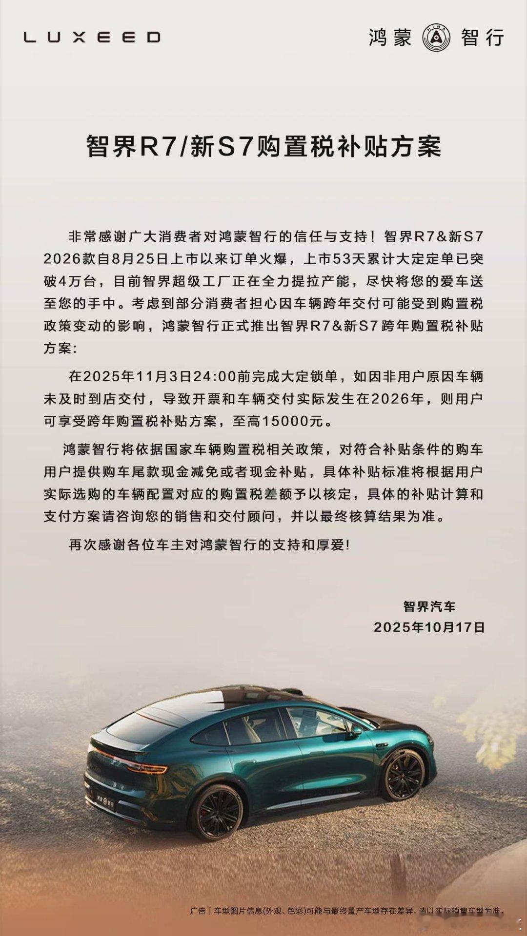 看到智界展台,发现智界汽车推出购置税补贴方案 智界汽车发布智界R7及新S7 2026款购置税补贴方案。在2025年11月3日24:00前完成大定锁单的用户,因跨年交付可能涉及的购置税政策变动问题,可享至高15000元的购置税兜底!确实,智界真