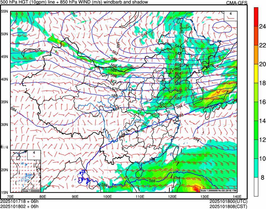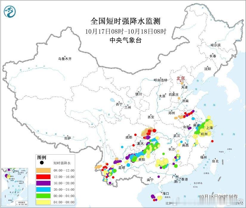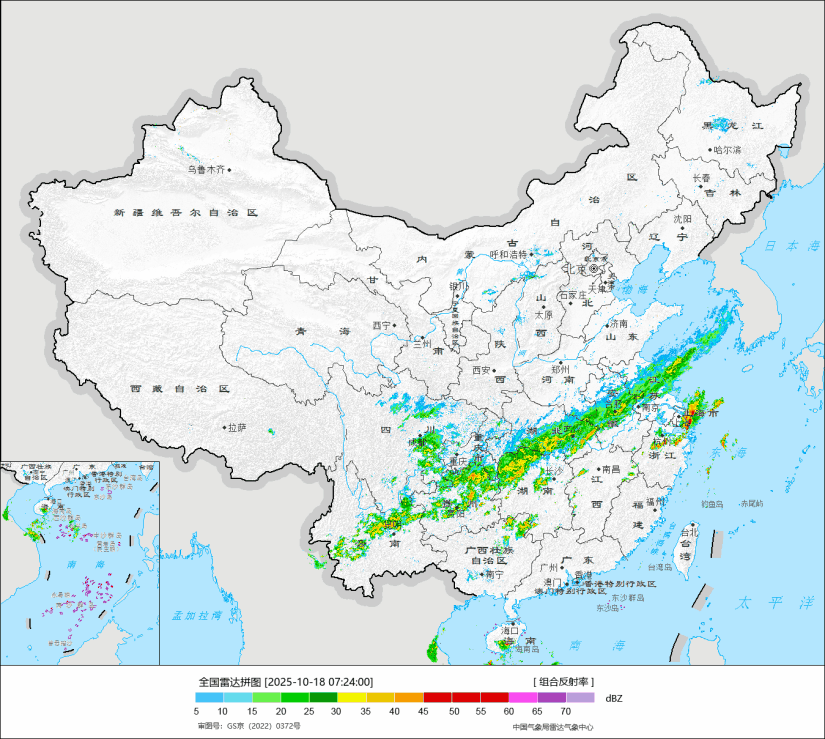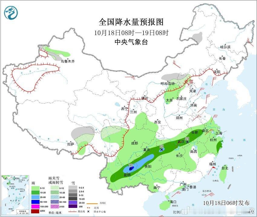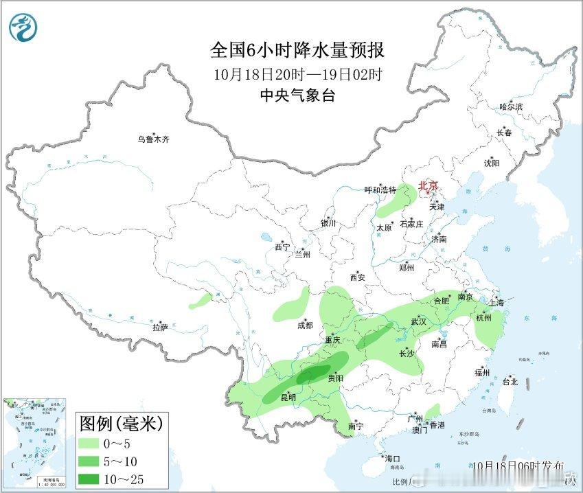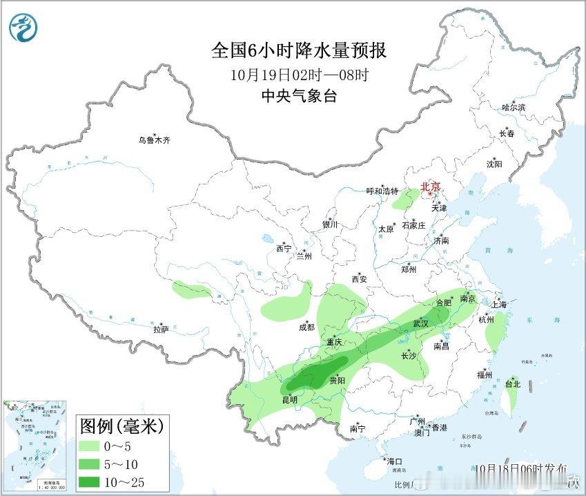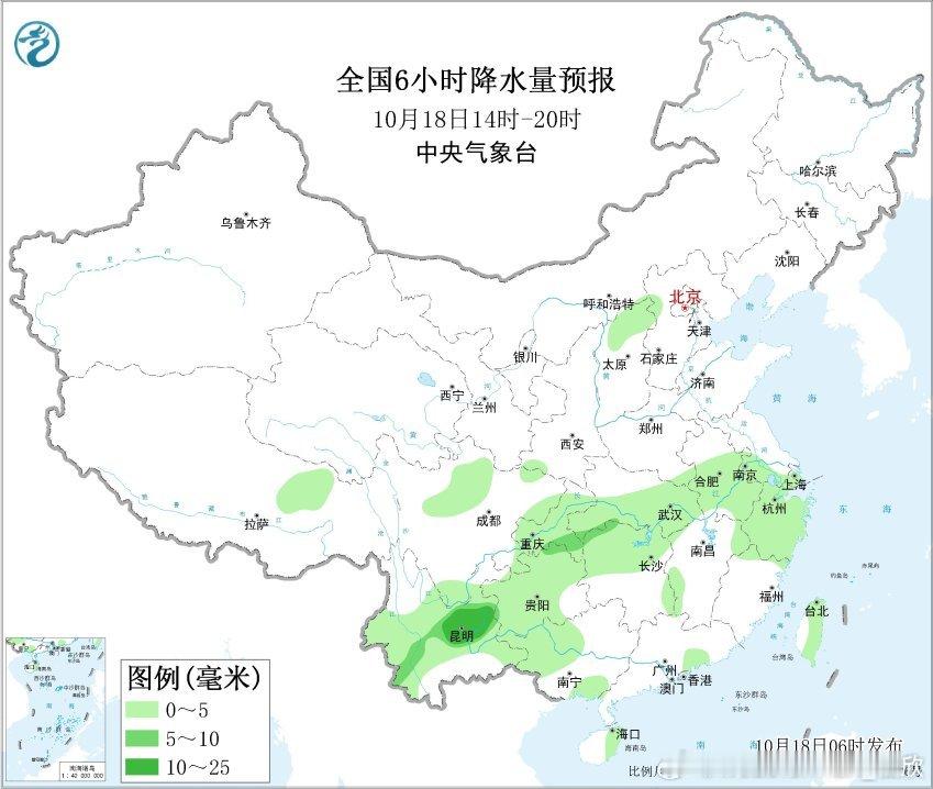 预计10月18日08时至19日08时,云南中部和东北部、贵州中北部、重庆东南部、湖南北部、湖北南部和东部、安徽西南部、浙江东部沿海等地部分地区有中到大雨,其中,云南东北部局地有暴雨(50~70毫米)。
